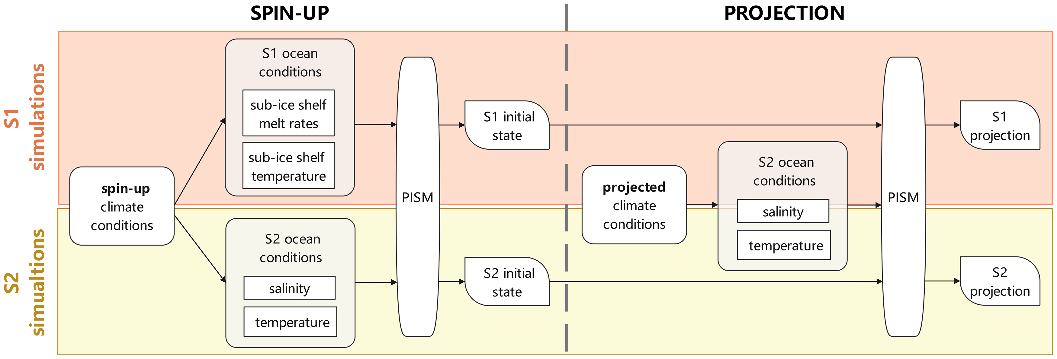 Figure 3Overview of model spin-up and projection processes. The schematic summarizes the model setup during spin-up and projection. The ocean initialization employs two distinct schemes: using observed basal melt rates along with ice-shelf basal temperature (S1 simulations, orange box), and using Southern Ocean temperature and salinity (S2 simulations, yellow box; reproducing LOW21). Projections initialized from these two ice-sheet states and forced with an identical basal melting method (Eq. 2) as well as future oceanic conditions from 2015 to 2100.