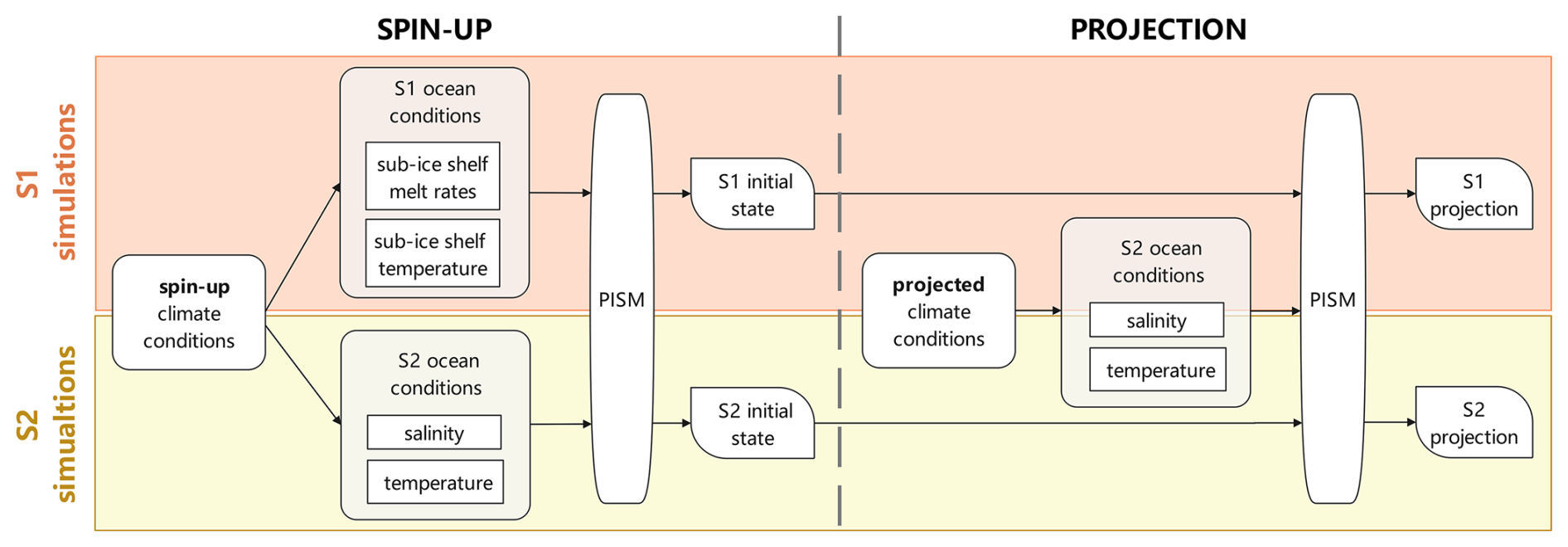 In summary, with the above approach, we produced two sets of simulations that differ essentially only in their ice-sheet initial state (Fig. 3). During spin-up, “S1 simulations” were forced by the basal melting derived from Eq. (1), and “S2 simulations” were forced by basal melting obtained from Eq. (2). For the projections, both S1 and S2 simulations were forced using the same method – basal melting calculated from Eq. (2), driven by salinity and temperature from climate scenarios. For S1 simulations, projections were performed for both RCP and SSP scenarios, while S2 simulations, which were obtained from LOW21, were conducted only for the RCP scenarios. Although S1 simulations are initialized with the S1 method (Eq. 1), but driven by the S2 parameterization (Eq. 2) for projections, their results are not contaminated by a potential shock (Appendix A).