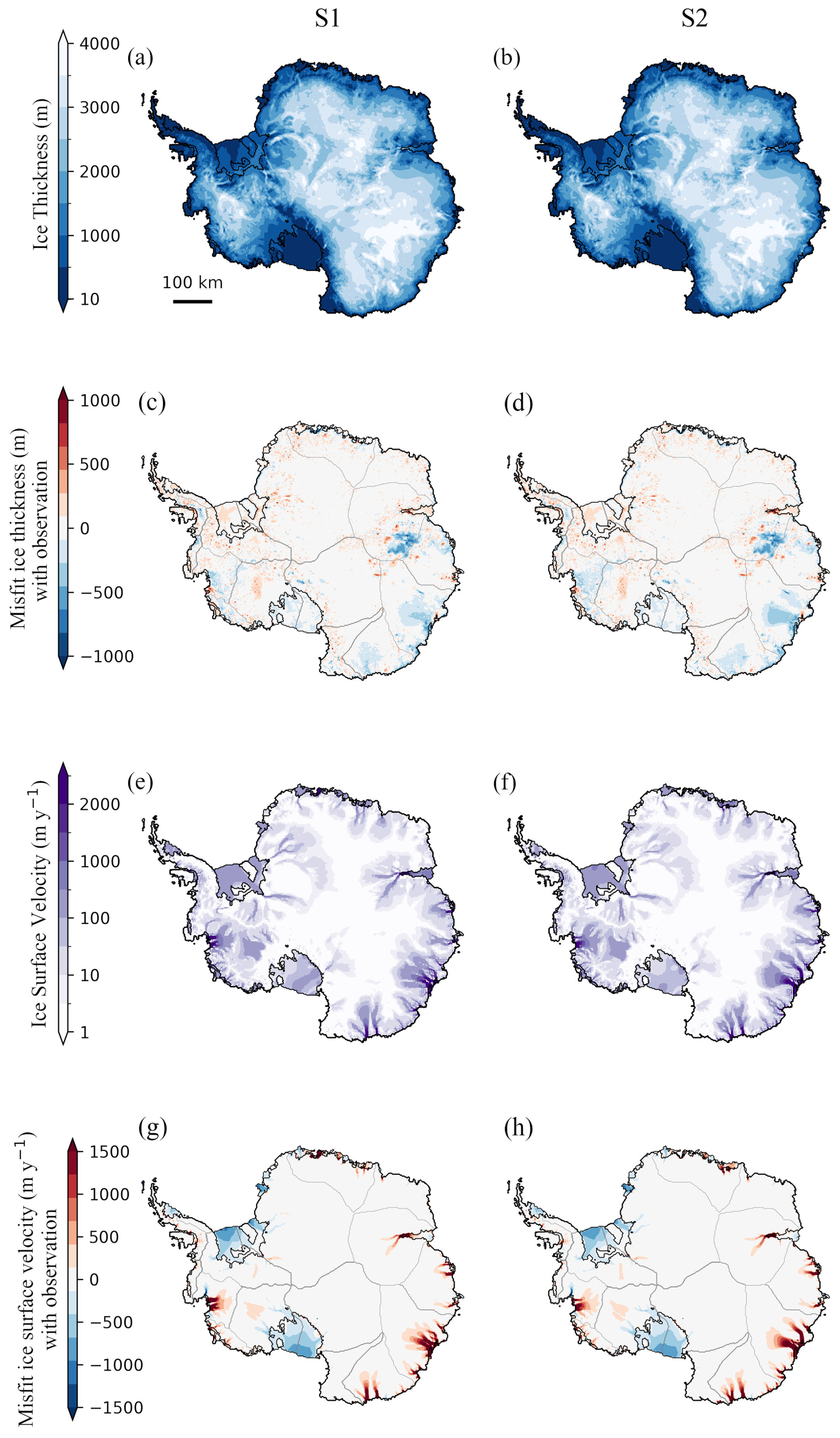 Figure 4Comparing simulated initial state with observations. Modeled ice thickness (m) and ice surface velocity (m yr−1) at the end of spin-up. The left column shows ice thickness and ice surface velocity results from S1, alongside their misfits from observation (Morlighem et al., 2019; Mouginot et al., 2019). The right column shows the corresponding results from S2, sharing common color bars with S1.