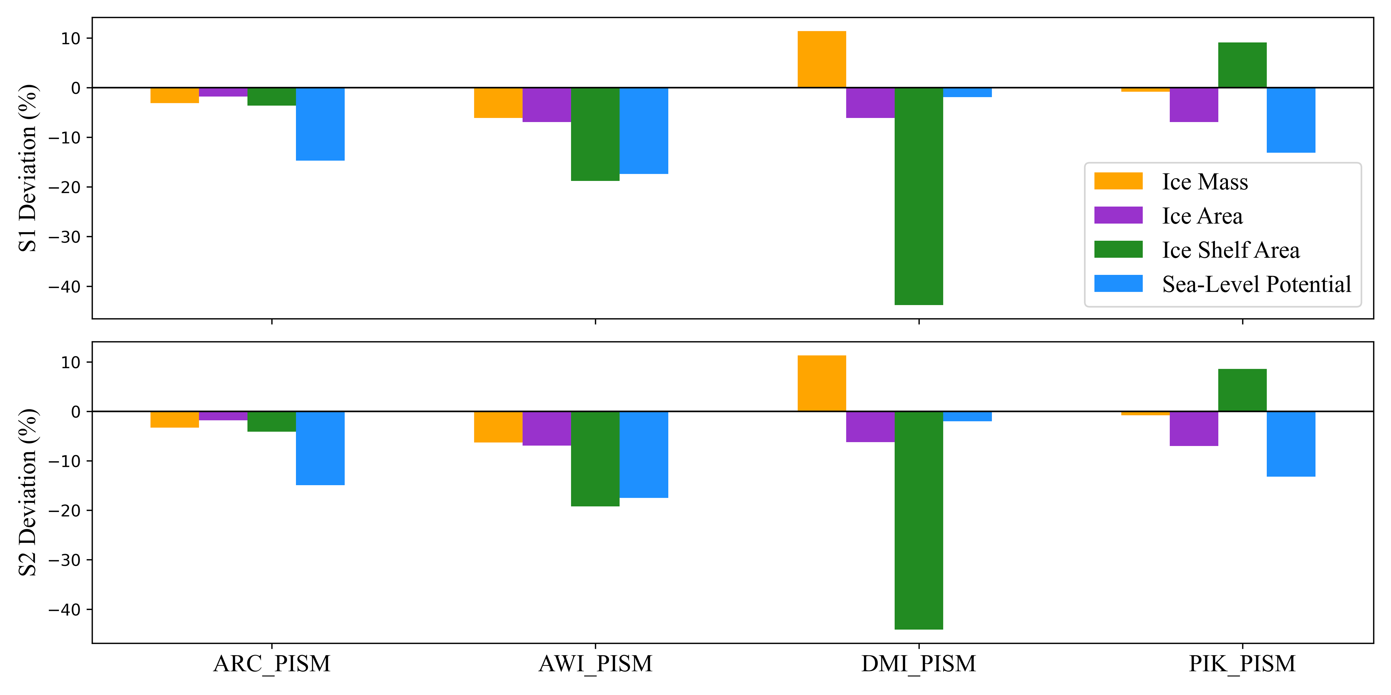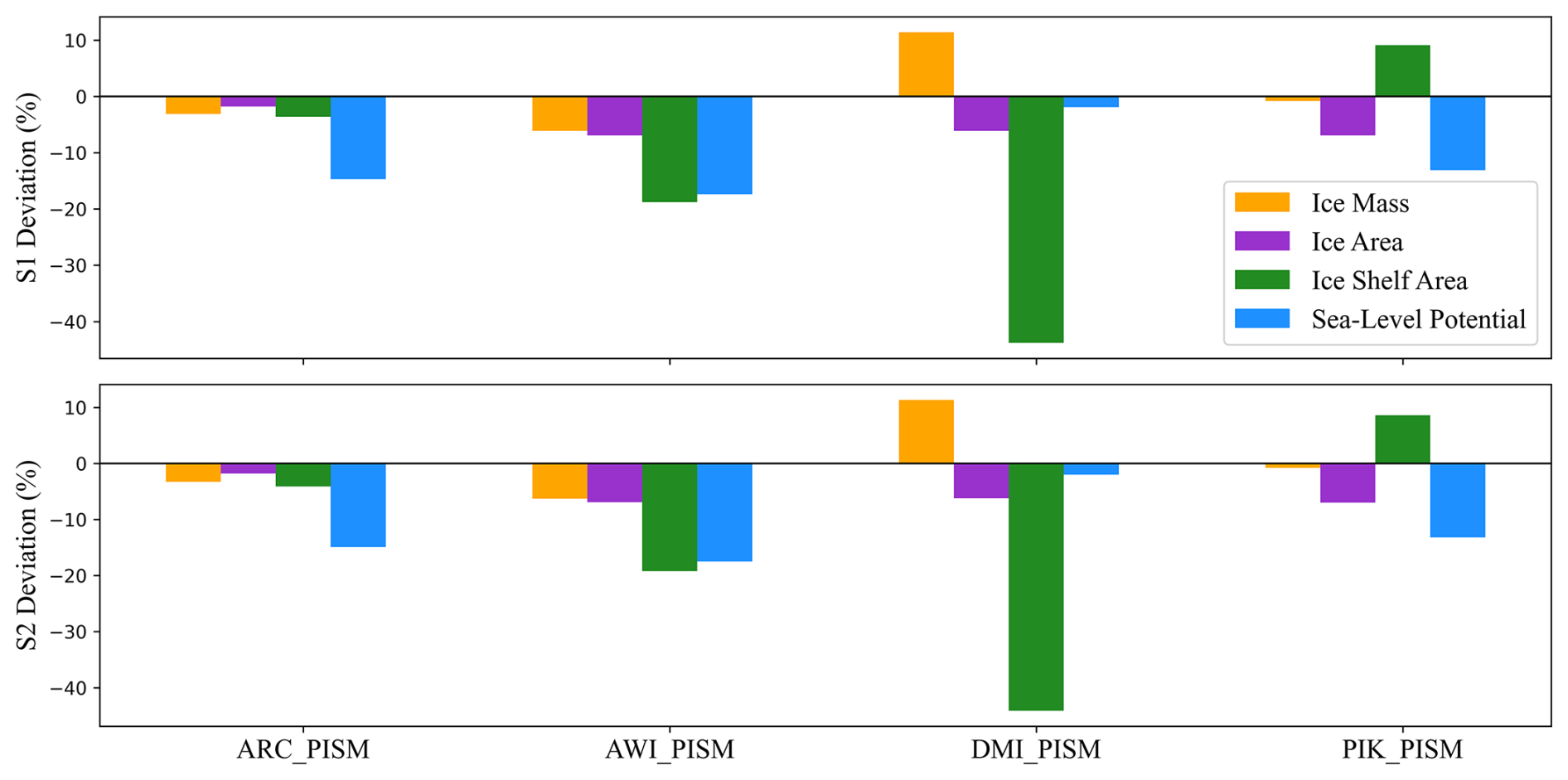 Figure 5Percentage deviations in steady-state metrics (ice mass, ice sheet area, ice shelf area, potential sea-level contribution) relative to the initMIP-Antarctica PISM-based ensemble. The vertical axis represents the percentage deviation between the results of S1, S2, and the simulations from participating institutions (*_PISM, where * denotes the institution abbreviation).