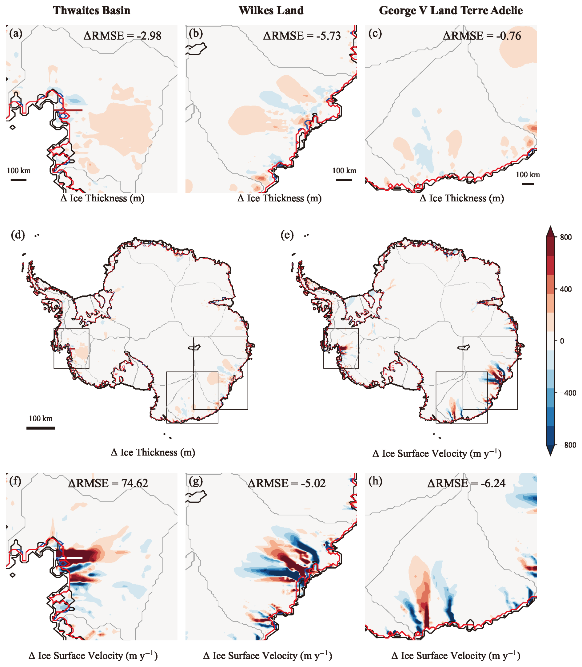 Figure 6Comparison of spin-up ice thickness and ice surface velocity differences between S1 and S2. (a–c) Ice thickness differences (S1–S2) in the TB, WL, and GVL, respectively. (f–h) Ice surface velocity differences (S1–S2) in the TB, WL, and GVL, respectively. The difference in root mean square error between S1 and S2 (ΔRMSE = RMSES1–RMSES2), compared to observations. (d) and (e) present the deviations in ice thickness and ice surface velocity between two simulations, with three black boxes highlighting regions showing the most significant discrepancies. Grounding lines: S1 (red), S2 (blue), and observed data (black) from BedMachine v.3 (Morlighem et al., 2019). The profile line locations corresponding to Fig. 8 are in Thwaites Glacier: (a), (d) brown; (f) white.