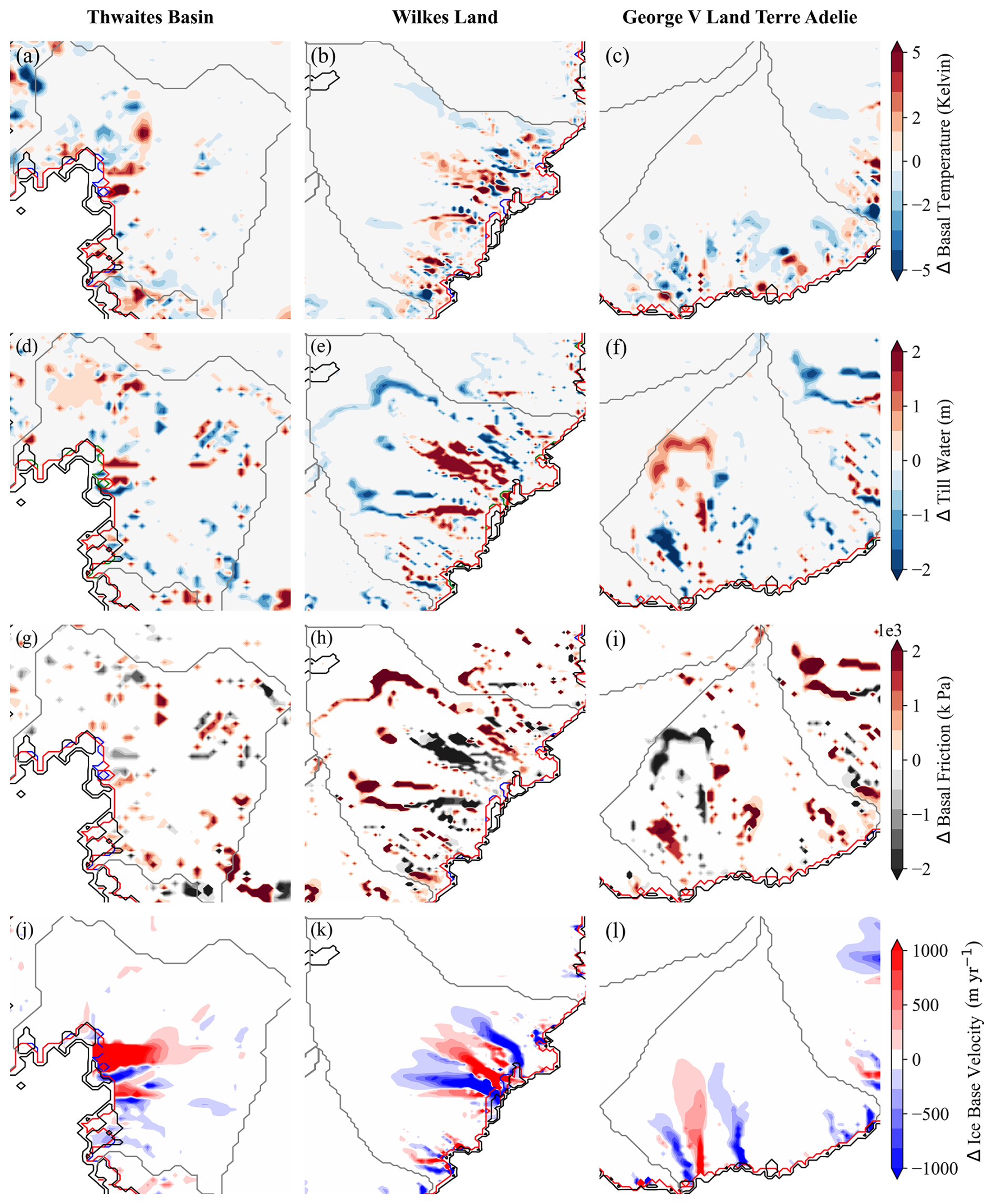 Figure 7Spatial distribution of differences (S1–S2) in basal ice temperature field (Kelvin) (a–c), basal till water content (m) (d–f), basal friction (k Pa) (g–i), and basal ice velocity (m yr−1) (j–l) in the three basins. The red and blue lines indicate the grounding-line positions for S1 and S2, respectively, while the black line represents the observed grounding line from BedMachine v.3.