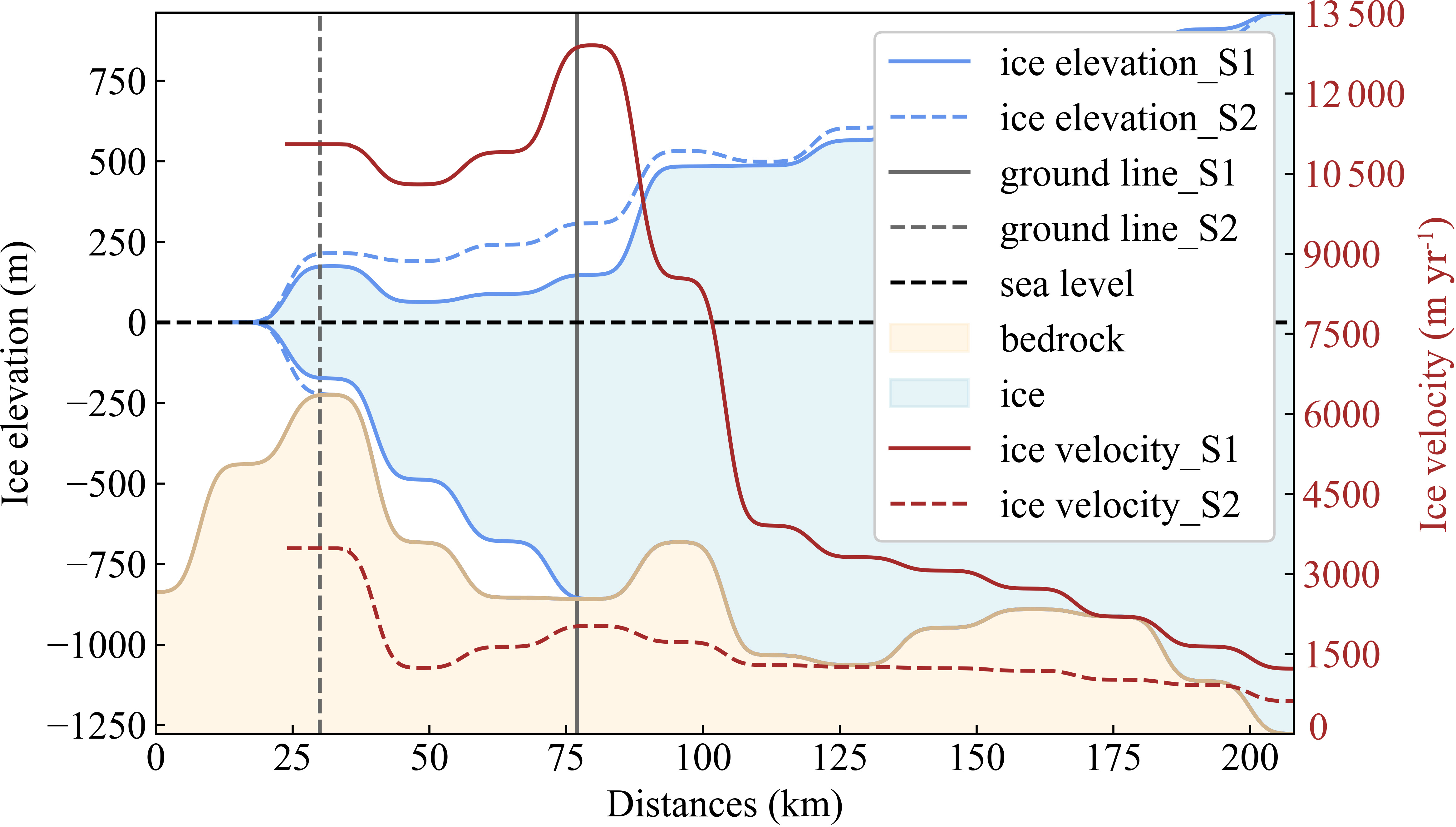 Figure 8Comparison between S1 and S2 along the Thwaites Basin transect after spin-up. Ice elevation (blue line), ice surface velocity (brown line), and grounding-line positions for S1 and S2 are indicated by the grey solid and dashed lines, respectively. Sea level: black dashed line.