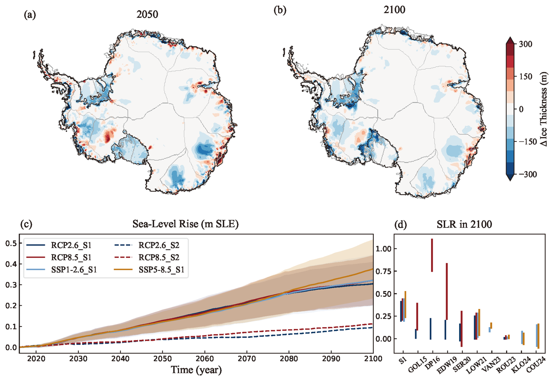 Figure 9Ice sheet thickness differences and projected contributions of the AIS to sea-level rise (m SLE). Spatial differences in the projected ice thickness between the S1 and S2 multi-scenario ensemble means for 2050 (a) and 2100 (b). The values are derived by averaging the differences (S1–S2) under the RCP 2.6 (RCP 2.6_S1, RCP 2.6_S2) and RCP 8.5 (RCP 8.5_S1, RCP 8.5_S2) scenarios in (c). (c) Predicted sea-level rise for “SGO scenario” to “SGF scenario” simulations in S1 under four scenarios (color shading) and mean values (color lines). The dashed lines represent projections from the S2 initial state – a set of results from the LOW21 ensemble projections: red for RCP 8.5, blue for RCP 2.6. (d) Projected contributions to sea-level rise (SLR) by 2100 from the S1 simulations, compared to other studies: CHU13 (Church et al., 2013), GOL15 (Golledge et al., 2015), DP16 (DeConto and Pollard, 2016), EDW19 (Edwards et al., 2019), SER20 (Seroussi et al., 2020), LOW21 (Lowry et al., 2021), VAN23 (van der Linden et al., 2023), KLO24 (Klose et al., 2024), and COU24 (Coulon et al., 2024).