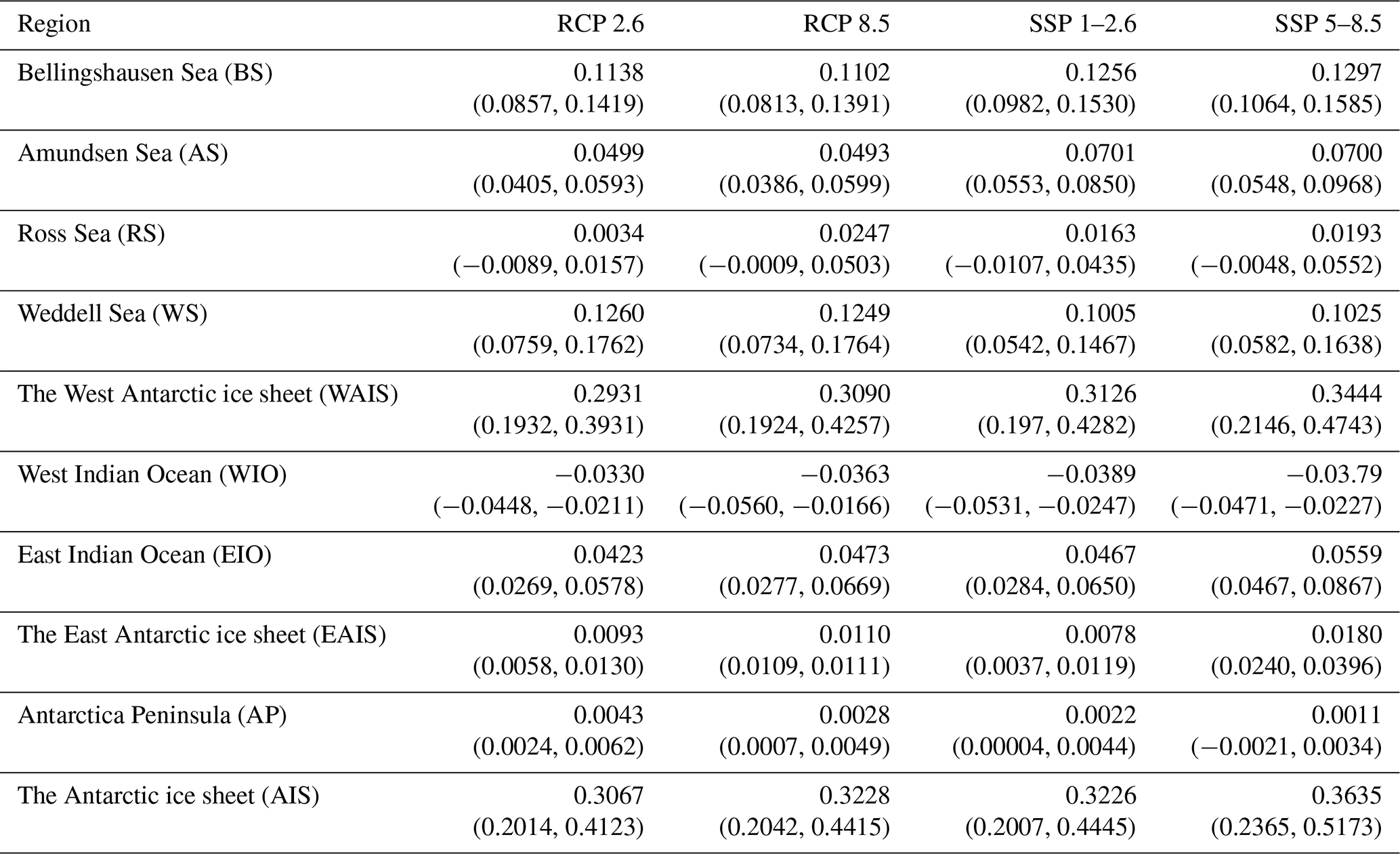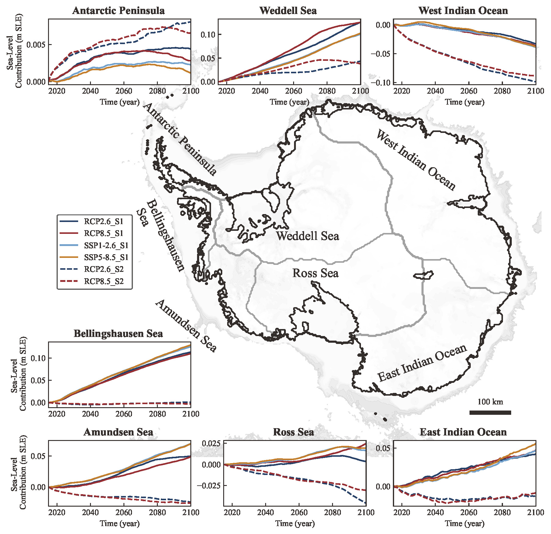 Table 2Sea-level contribution (m SLE) of Antarctic ice sheet Basins by 2100 in S1 projections. The confidence intervals represent the range of sea-level contribution from the “SGO scenario” to the “SGF scenario” simulation across different RCP/SSP scenarios; the single value denotes the mean value of this range.