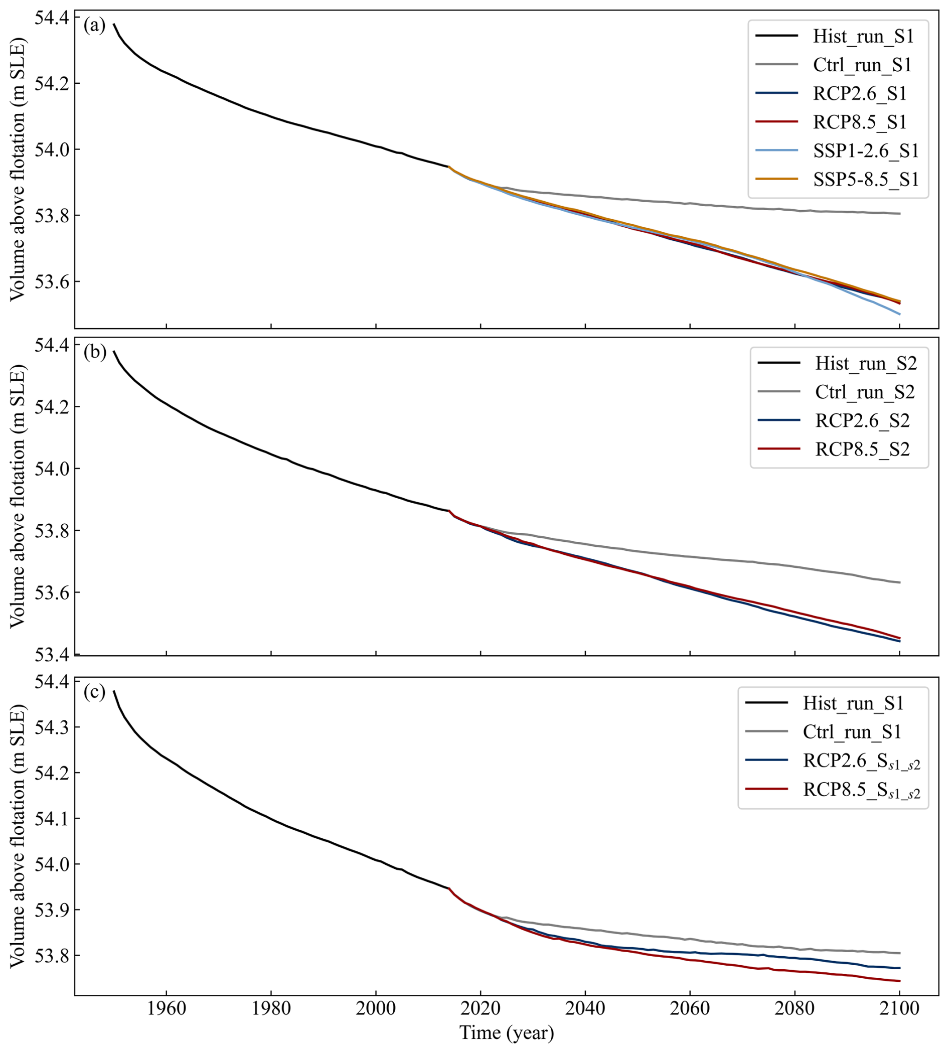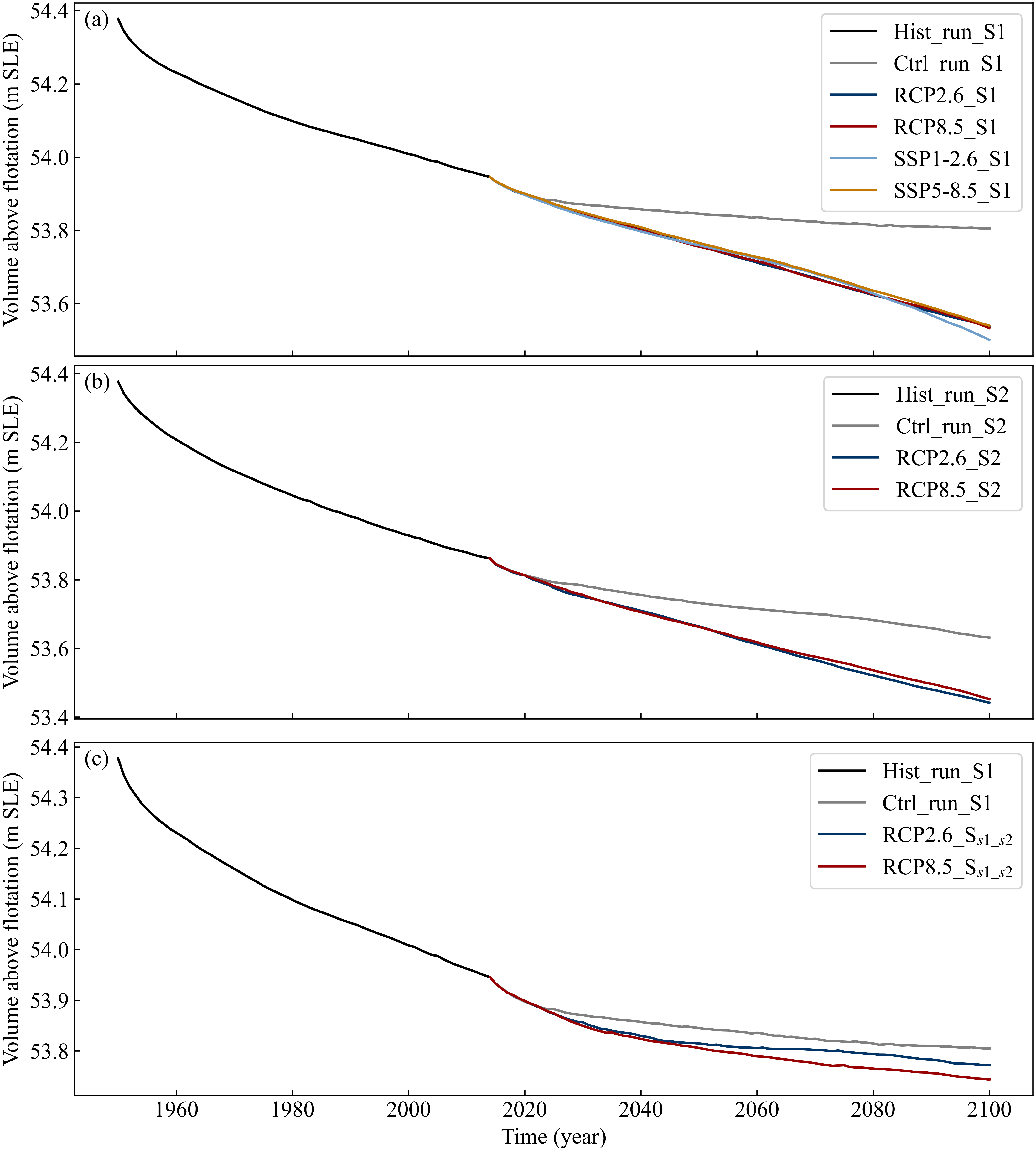Figure A1Ice volume above flotation (VAF) during spin-up and projection for (a) S1, (b) S2, and (c) SS1_S2 simulations. Black lines denote the historical spin-up, coloured lines show projections under RCP/SSP scenarios (light blue, red, dark blue, orange) and a constant-climate control run (grey).