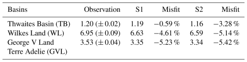 A comparison of simulation results for ice volume above flotation between S1 and S2 across three marine ice sheet basins (TB, WL, and GVL; Table 1) reveals that the ice-sheet model driven by observed sub-ice shelf melt rates achieves slightly better alignment with observations. Although the RMSE of ice surface velocity in the TB shows an increase of 74 m yr−1 in S1 compared to S2 (RMSES1–RMSES2; Fig. 6f), the bias in ice volume above flotation decreases by approximately 2.8 %, while the biases for WL and GVL are reduced by 0.5 % and 0.2 % (Misfit_S1–Misfit_S2; Table 1), respectively.