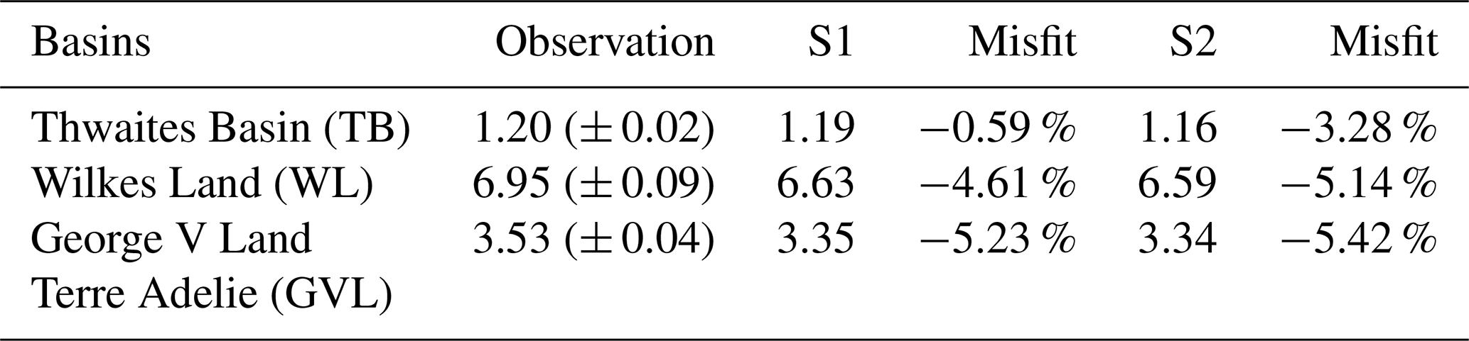 Table 1Ice volume above flotation (m SLE) in three marine ice sheet basins after spin-up, simulated at 16 km resolution. Misfit (in %) denotes the percentage deviation of the S1 and S2 simulation results from observations, respectively.