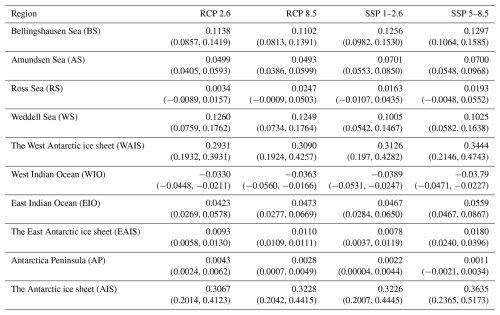 To explore the spatially variable response of the AIS, we partitioned the ice sheet into seven sectors based on their adjacency to surrounding oceans (Fig. 10). This regional breakdown reveals stark contrasts in the mechanisms and magnitudes of sea-level rise across the WAIS, EAIS, and AP (Fig. 10; Table 2), highlighting their distinct sensitivities to climate forcings. The WAIS emerges as the primary driver of AIS-related sea-level rise, contributing 0.29–0.34 m SLE by 2100. A mechanism similar to that observed in recent decades may be responsible for the projected mass loss. Specifically, anthropogenic warming could alter shelf-break wind patterns over the Amundsen and Bellingshausen Sea (AS/BS) embayments (Holland et al., 2019; Noble et al., 2020), potentially facilitating greater intrusion of warm water and intensifying ice melting beneath ice shelves (Dinniman et al., 2016; Noble et al., 2020; Li et al., 2023). The resulting reduction in ice-shelf buttressing accelerates ice discharge, which explains the dominance of the AS and BS sectors – accounting for  55 % of total WAIS mass loss in S1 projections (Table 2).