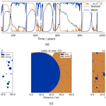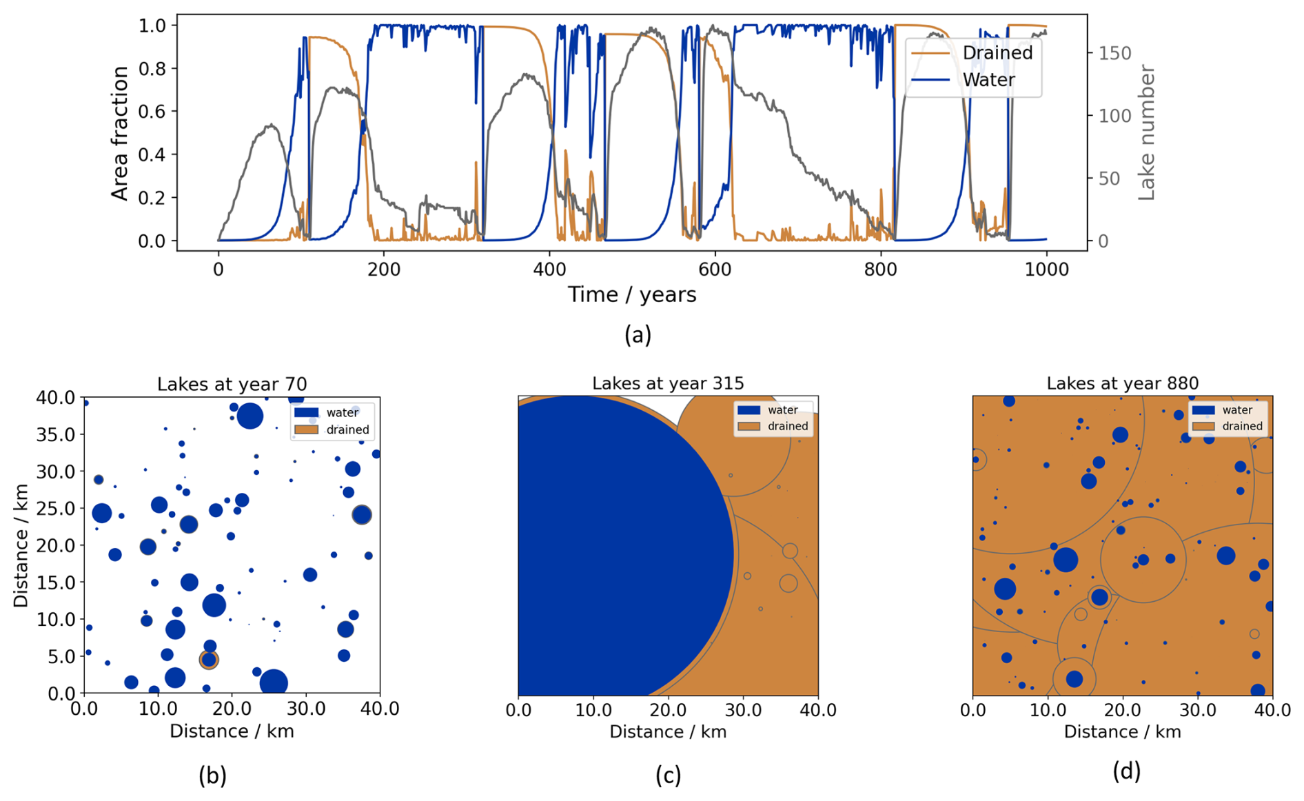 Figure 3Model output for an idealized simulation for an oscillating regime (“Regime B”) using the parameter values from Table 2: Timeseries of water and drained area fraction as well as lake number (a) and spatial representation of lake distribution and drained area extent for simulation year 70 (b), year 315 (c) and year 880 (d). Water area is displayed in blue and drained area in light brown.