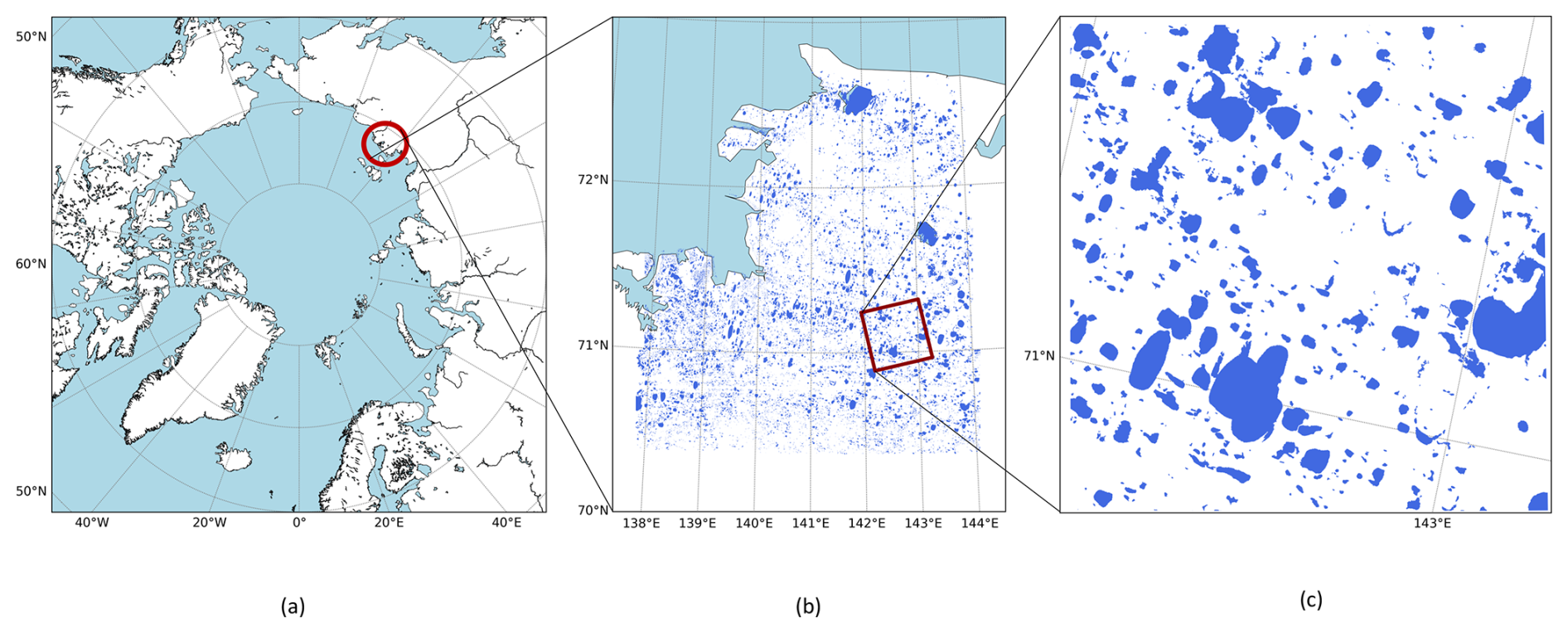 Figure 1Study region with location of the lake change dataset. An Arctic stereographic projection map shows the location of the study region in Eastern Siberia at the coast between Laptev and East Siberian Sea (a). The study region and calculated lake footprint dataset encompass the northern part of UTM Zone 54. The lakes from the dataset are shown as blue polygons (b). We focus on a random 40 km×40 km cell within that region (c).