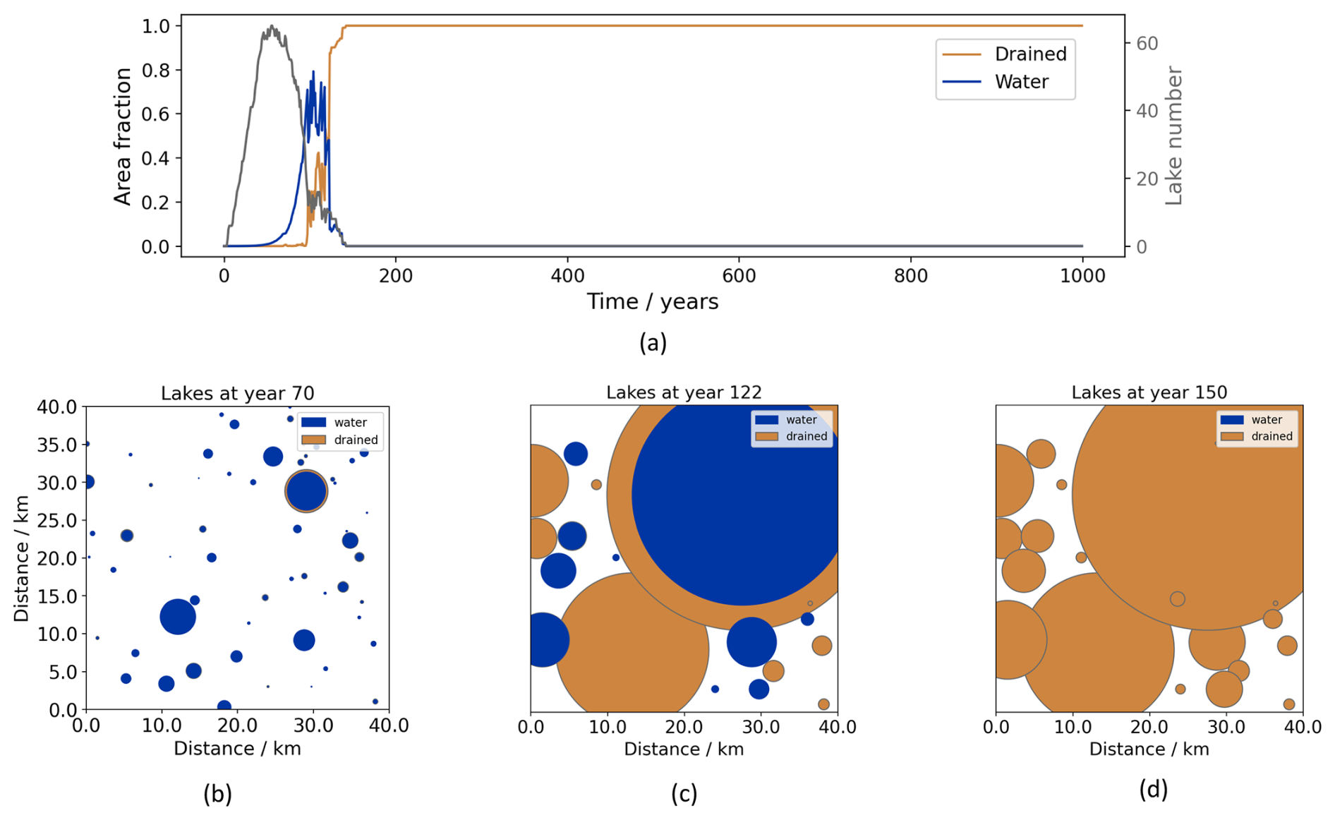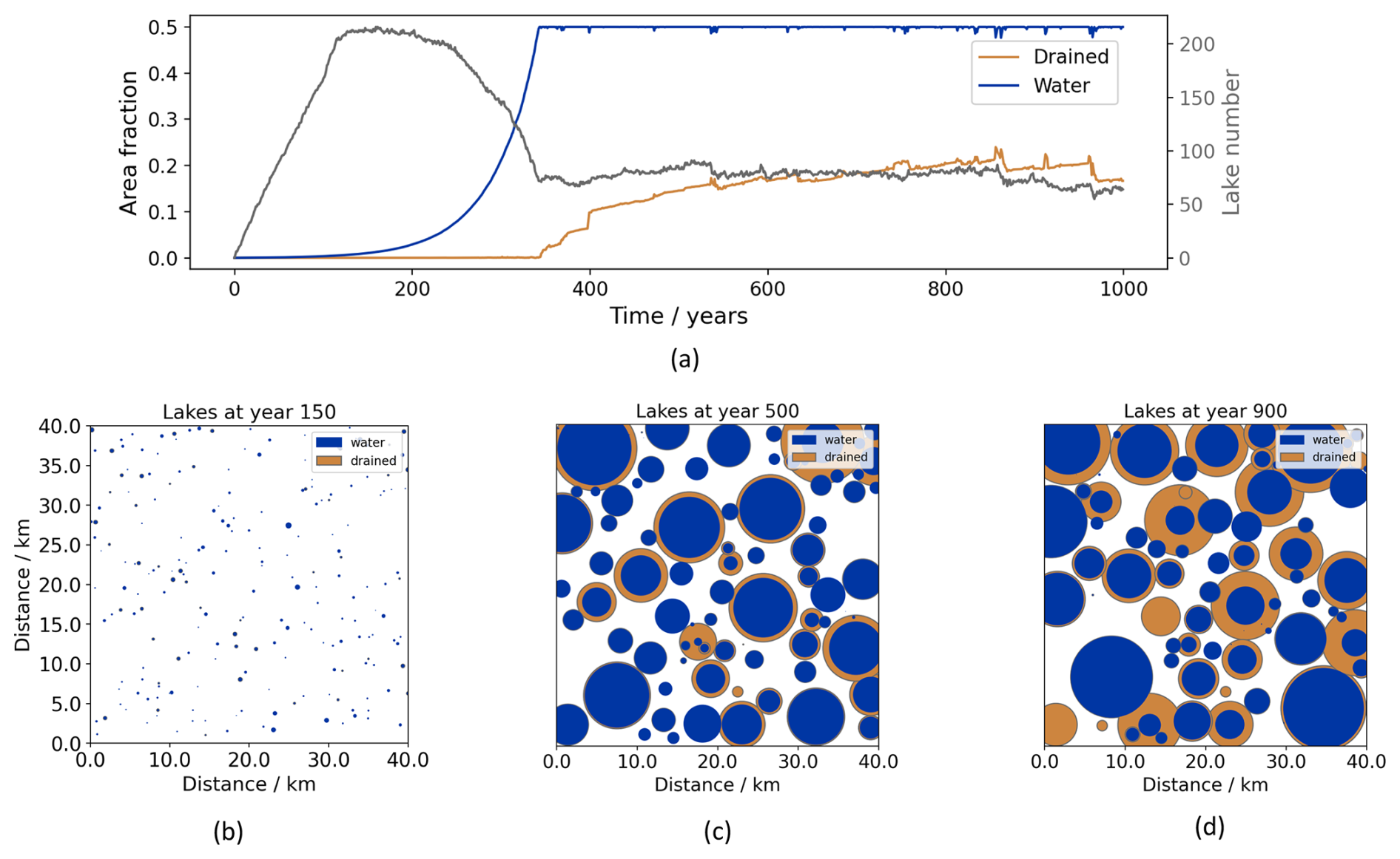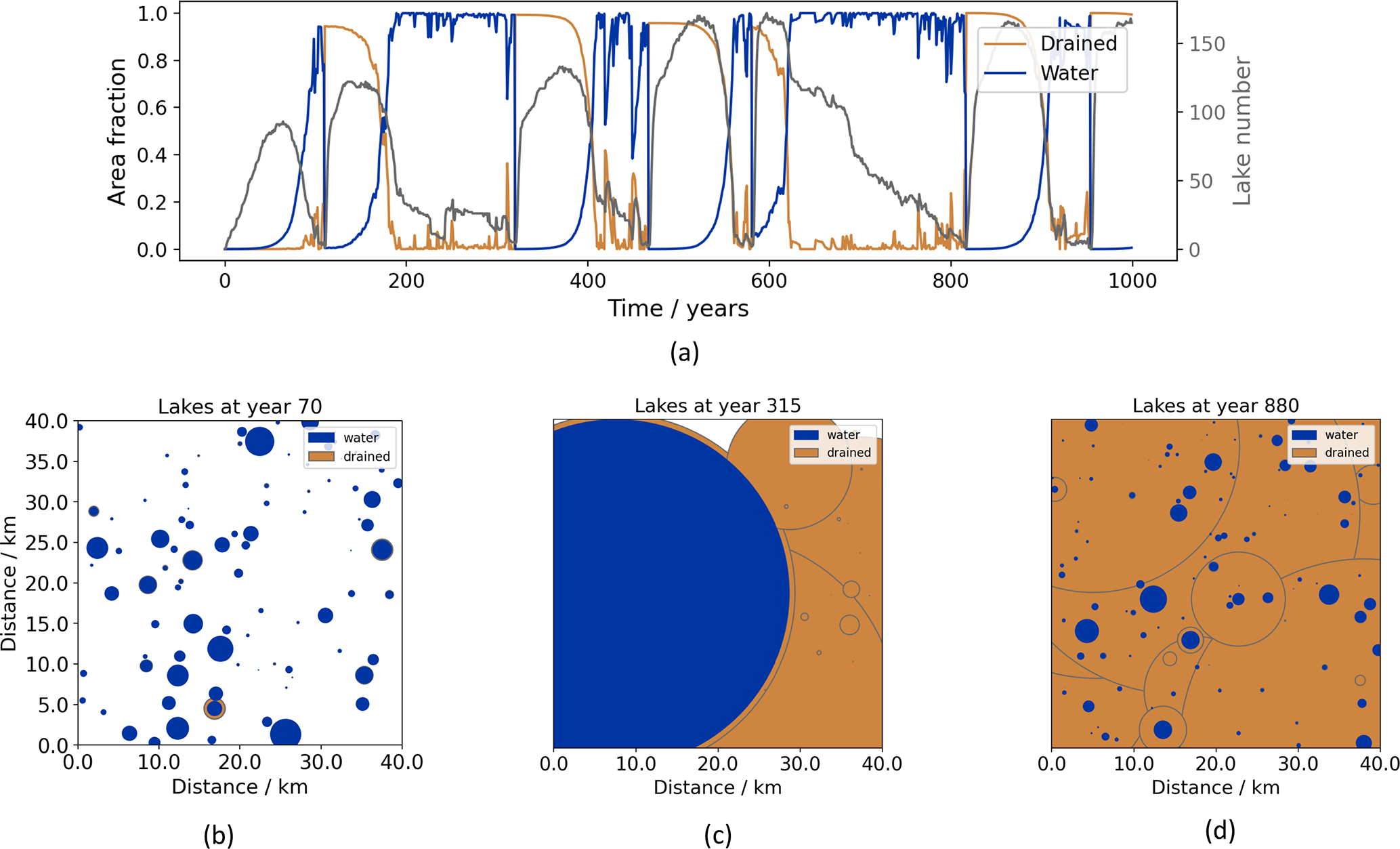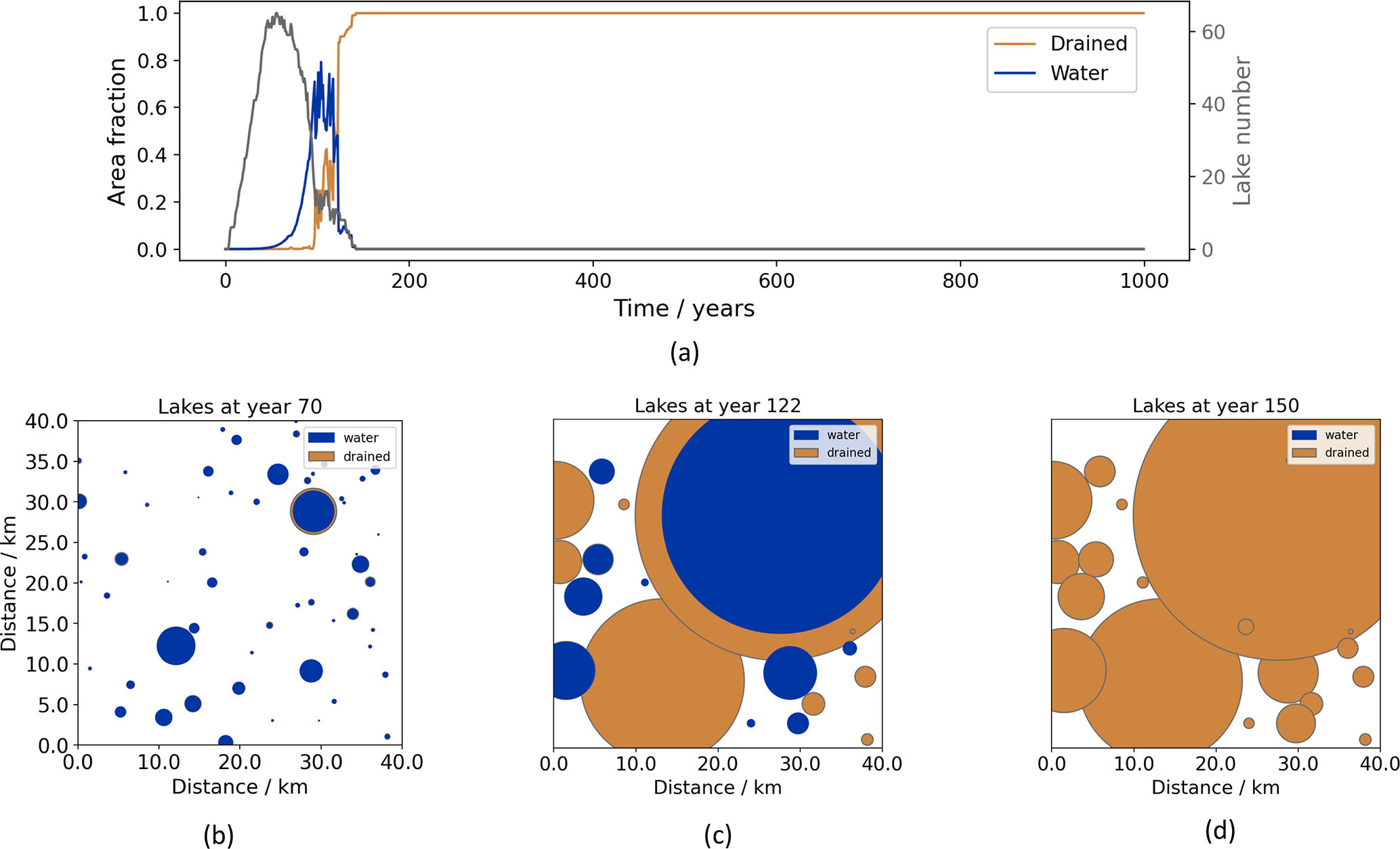 Figure 2Model output for an idealized simulation for a complete drainage regime (“Regime A”) using the parameter values from Table 2: Timeseries of water and drained area fraction as well as lake number (a) and spatial representation of lake distribution and drained area extent for simulation year 70 (b), year 122 (c) and year 150 (d). Water area is displayed in blue and drained area in light brown.