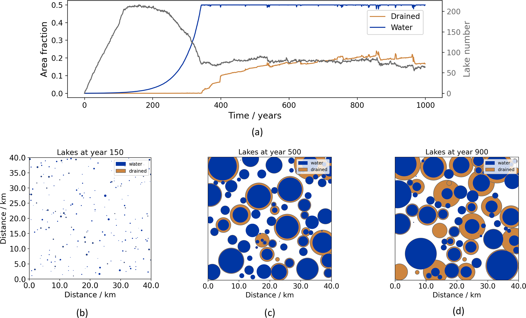 Each lake is defined by the coordinates of its centre and its surface area. The coordinates are randomly chosen from a uniform distribution, meaning that each lake initiation location is randomly distributed in space. The lake's location is relevant for the model's merging algorithm. At each time step, the model will check for overlapping lakes and merge them by adding the area of the smaller lake to the larger lake and calculating a new centre of mass. The smaller lake is then deleted from the lake inventory. We use this simplistic merging algorithm to keep the model from creating overlapping lake areas and as a first step to account for lake merging without resolving spatial surface and sub-surface heterogeneities.
