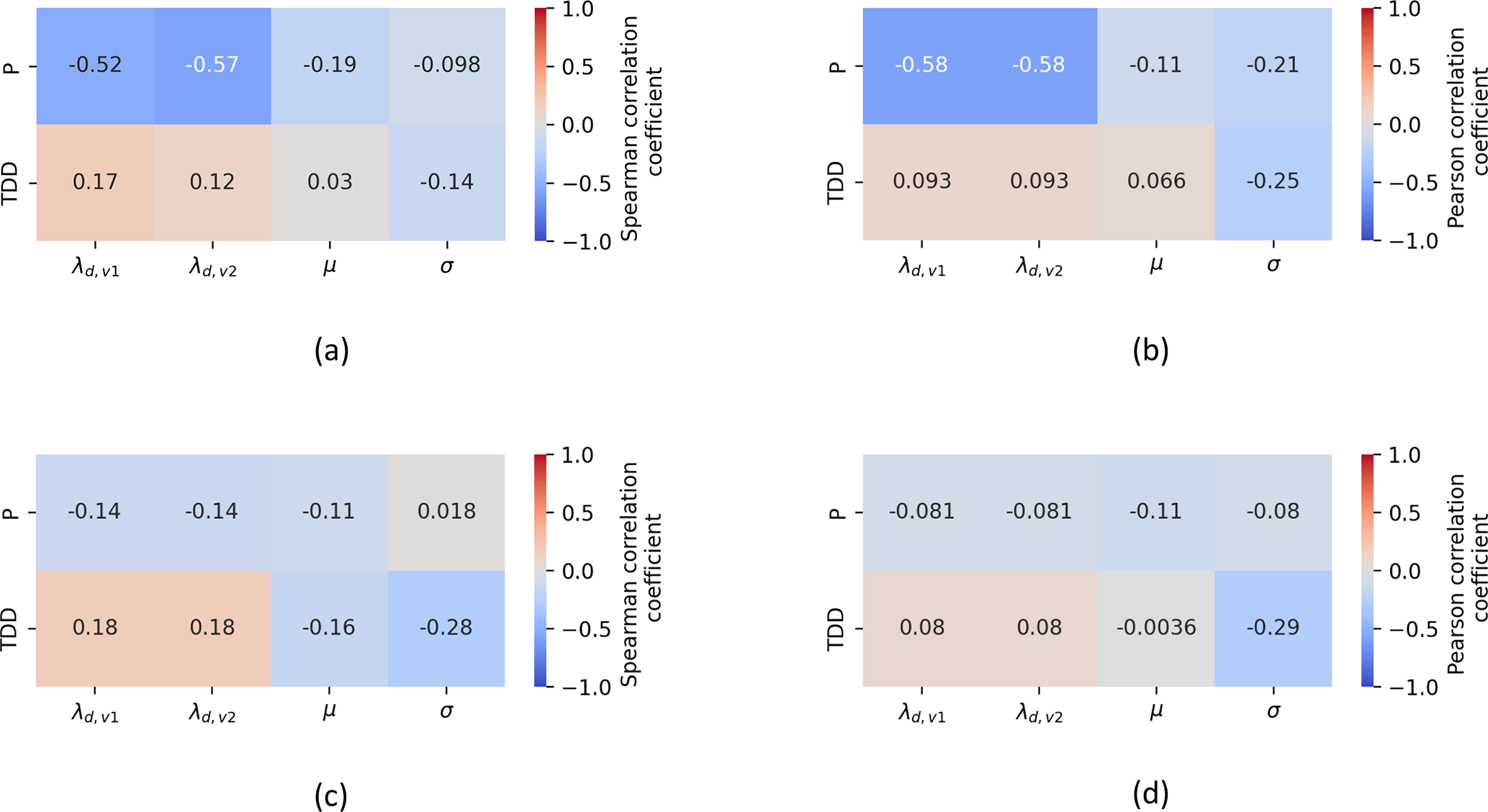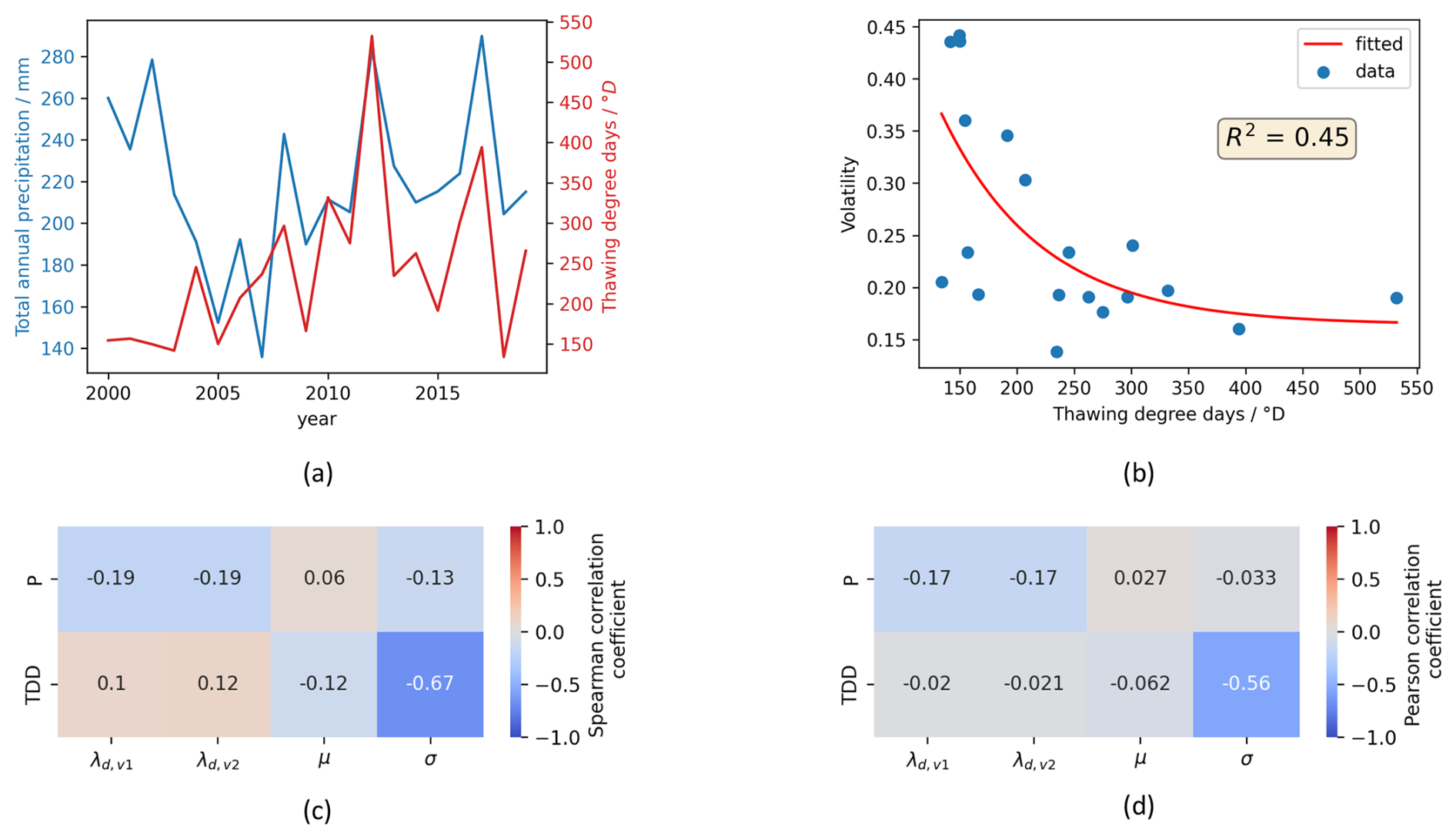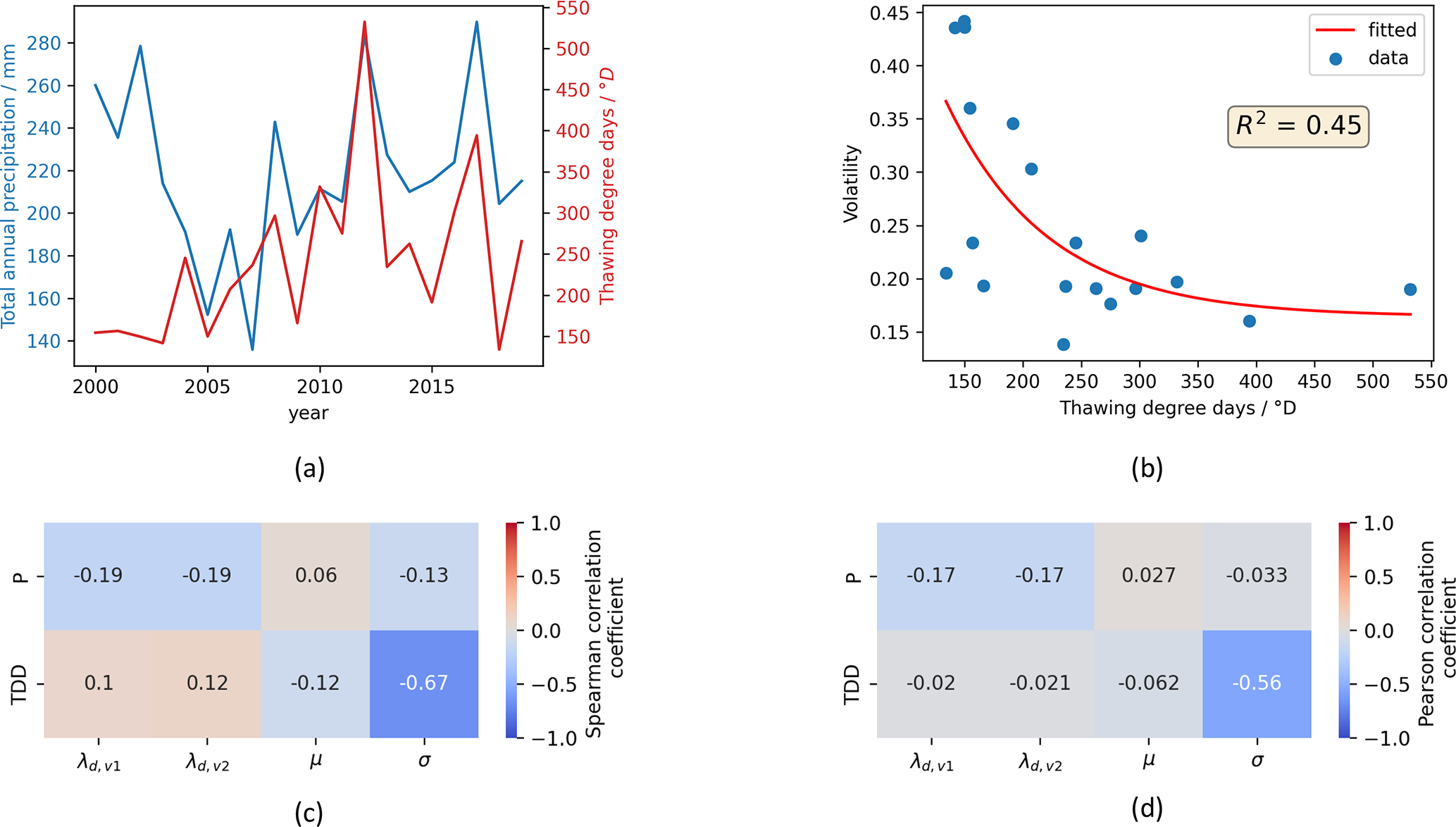 Figure 5Thawing degree days TDD and annual total precipitation P between 2000 and 2020 in the study region (a). The data was derived from daily GSWP3 data (Lange et al., 2021). Exponential fit between calculated volatility σ and TDD of the previous year (b). Spearman (c) and Pearson (d) correlation coefficient between parameters and the previous year's TDD and annual precipitation in the study region between 2000 and 2020.