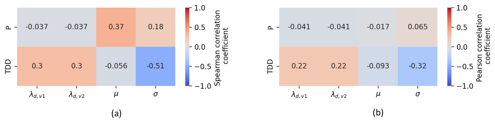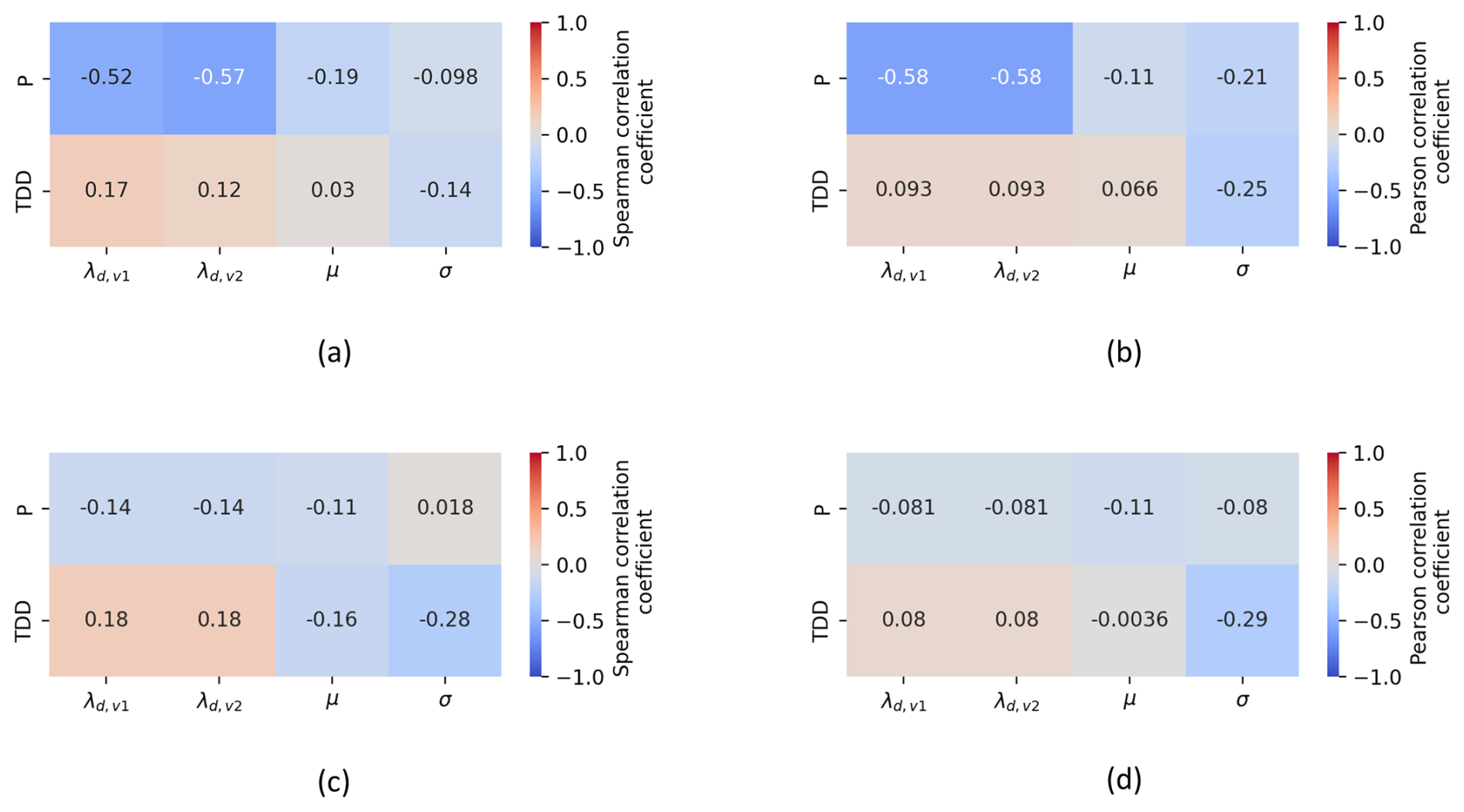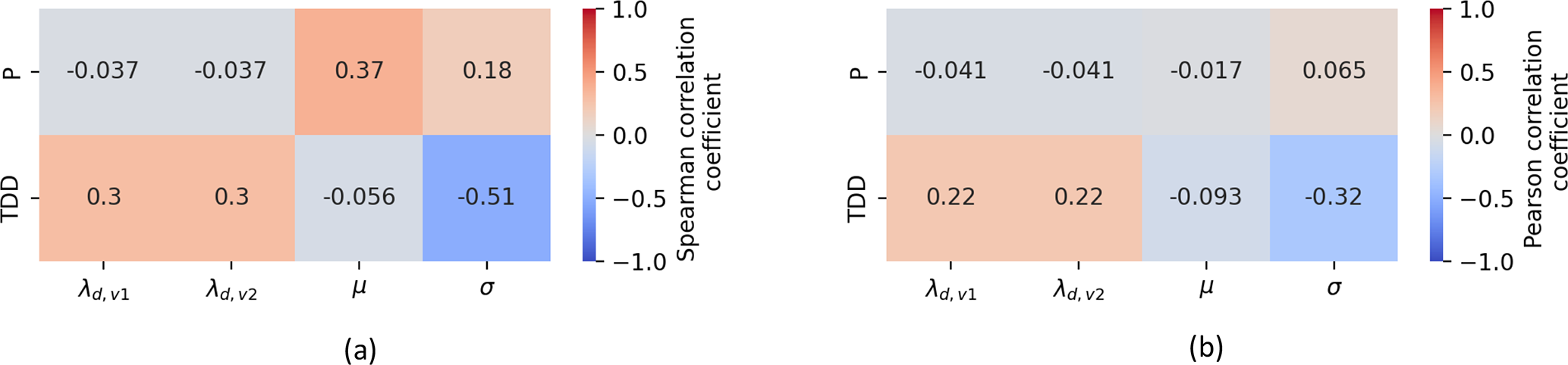 Figure 6Spearman (a) and Pearson (b) correlation coefficient between parameters and previous year's thawing degree days TDD and annual precipitation P in the random 40 km×40 km cell within the study region between 2000 and 2020.