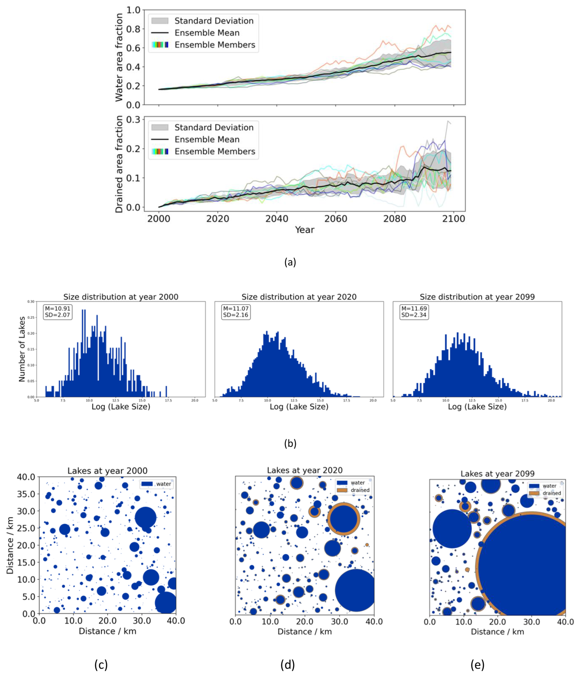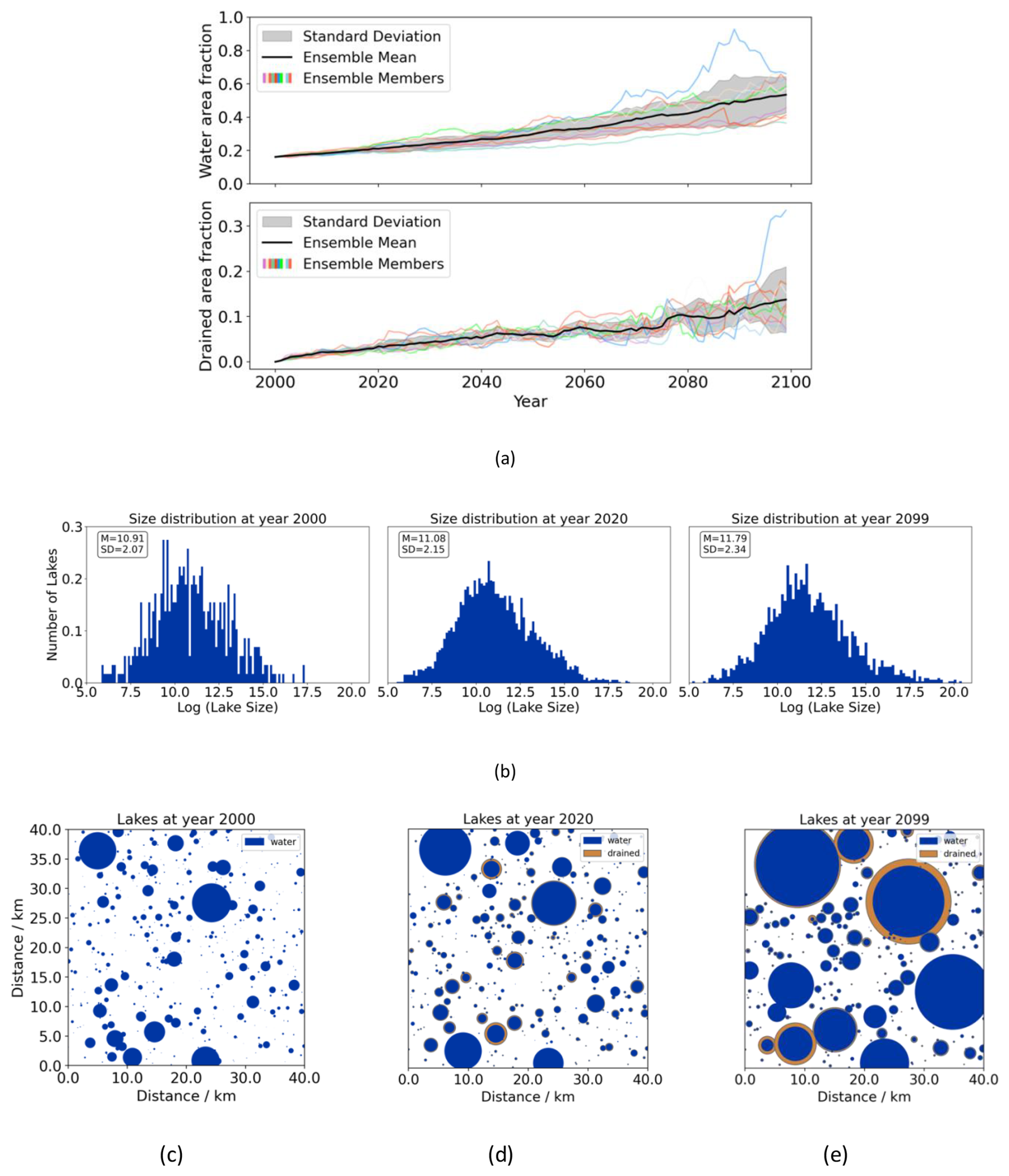 In another study, Victorov et al. (2019a) considered the development of drained lake basins, often called “khasyreis” in Russian literature, and derived a theoretical statistical distribution of their sizes with a similar analytical approach. Assuming that the distribution of fluvial drainage sources is assumed to correspond to a Poisson distribution and following the same assumptions about lake formation and expansion as in Victorov et al. (2019b), they find that the average radii and diameters of drained lake basins should follow the Rayleigh distribution, while their number across an area corresponds to a Poisson distribution. In Victorov et al. (2023), they calibrated their model and further modified it using meter-scale satellite imagery for different thermokarst sites in Siberia. Here, they also differentiate between thermokarst lakes that have formed on undisturbed area and secondary lakes that have formed in drained lake basins. They found that the observed size distributions for both mostly fit with theoretical integral-exponential distributions, but have different distribution parameter, and conclude that formation, expansion and drainage of thermokarst lakes is in dynamic equilibrium. Their approach does not directly consider influences of changing climate variables, but rather focuses on inherent lake dynamics under current conditions and drainage due to pre-existing fluvial erosion networks. Therefore it is not entirely suitable for projections of thermokarst landscape developments into the future.
