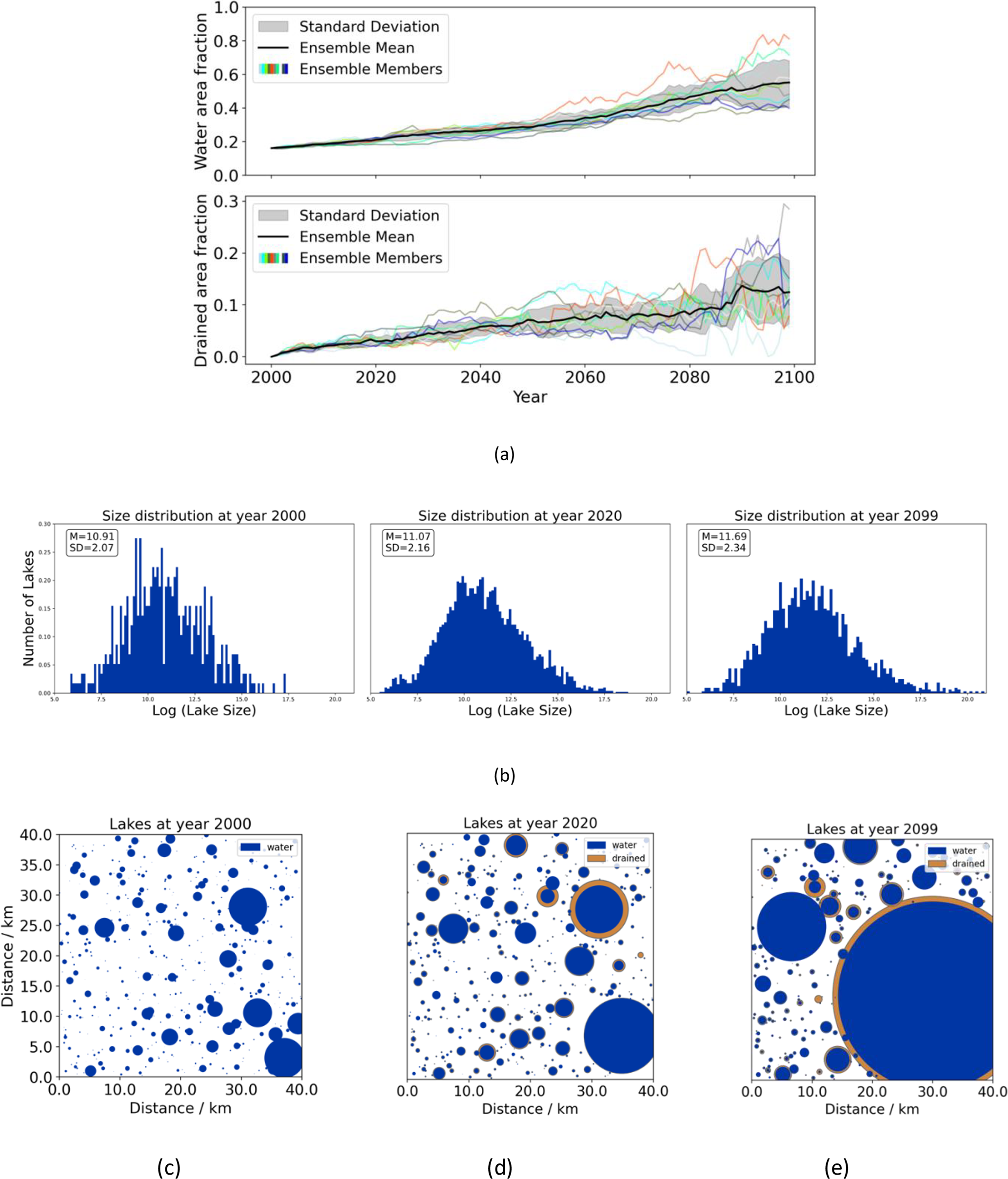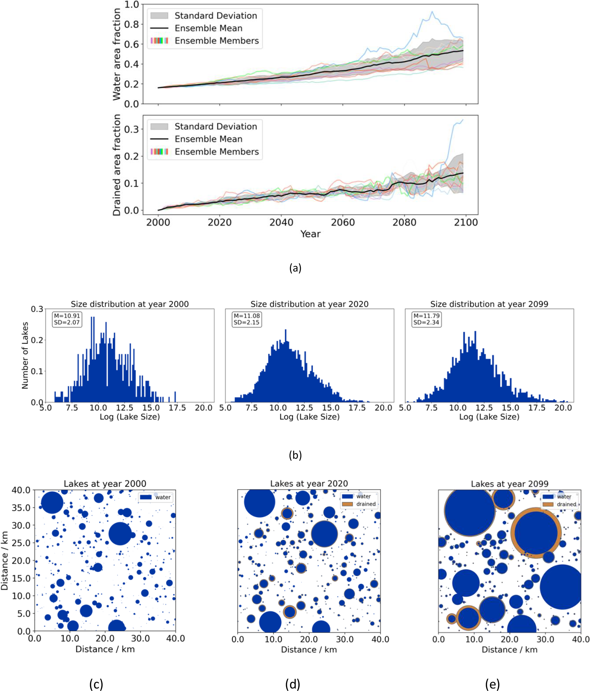 Figure 7Model output for an ensemble simulation with Variant 1 and using the parameter values from Table 3: Time series of water (top) and drained area fraction (bottom) of all ensemble members as well as ensemble means and SD (a). Histograms for size distribution across all ensemble members (b) at start of simulation (left), year 20 (middle) and year 2099 (right) with mean M and SD. Spatial representation of lake distribution and drained area extent of an example ensemble simulation for start of simulation (c), year 20 (d) and year 2099 (e) with water area displayed in blue and drained area in light brown.