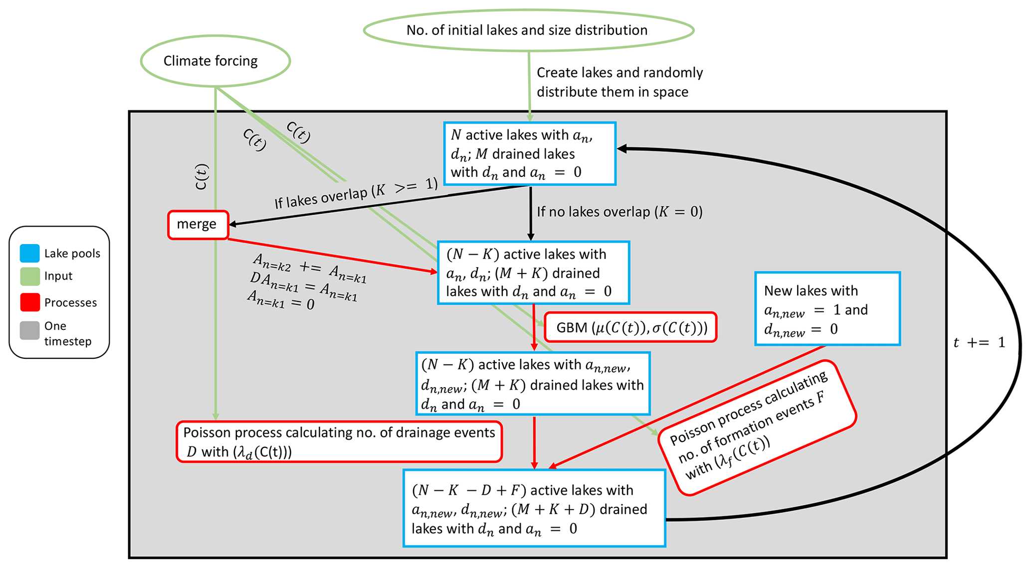 We use a time step of one year, thereby disregarding seasonal changes in lake area. The lakes' number n and annual surface areas change over time based on the following approaches. A theoretical derivation of a partial differential equation following our assumptions can be found in Appendix C.