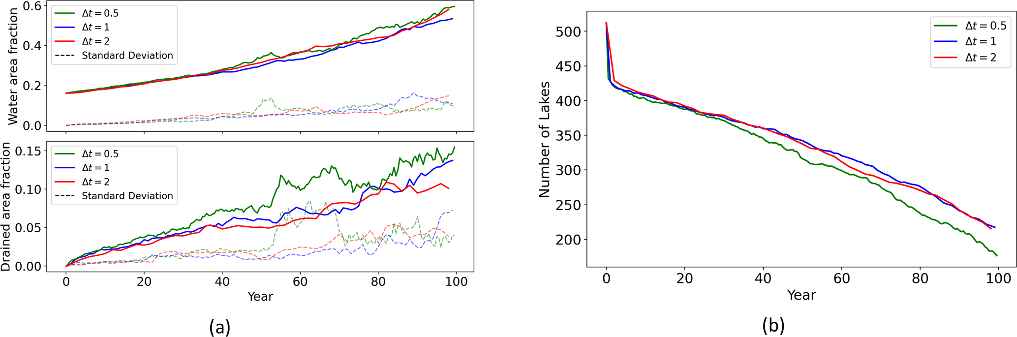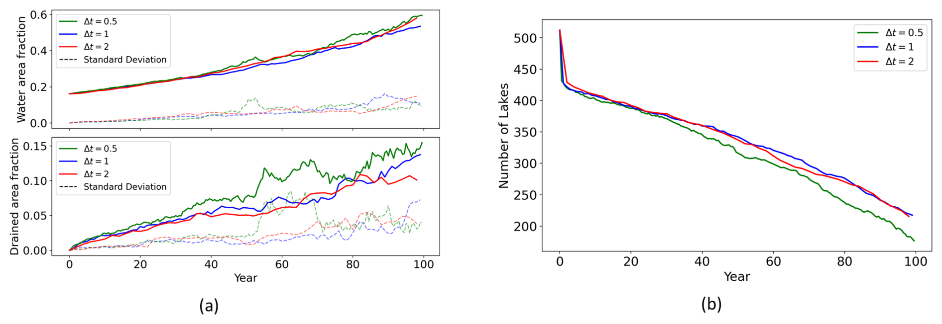 Since the model does not contain explicit seasonality, it is not suitable to investigate dynamics with temporal scales of less than a year. For this reason, the used time step should be one year or longer, even though the calculation of water and drained area fractions is largely time step independent, except for a small effect due to the merging algorithm (Appendix D).