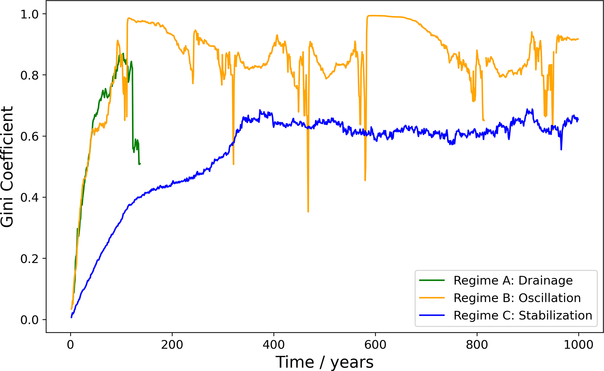 In the following, we discuss the idealized simulations as described in Sect. 2.3.1 and show timeseries of simulated water and drained area as well as lake number. For each regime, we also include three examples of spatial plots that show the active and drained lakes in the system from a bird's eye view at different times of the simulation. These spatial plots should be seen as visual aids to understand the lake distributions, rather than realistic representations of the simulated landscapes, since lake surfaces are simplified as circles in our model and the boundaries of the available landscape only affect area fraction implicitly. This is why lakes can be seen growing beyond the area's boundaries, even though overall water or disturbed area fraction is limited to a value of 1 or lower in all three simulations. A comparison of the Gini coefficients (e.g. Cowell and Flachaire, 2015) for the three simulations can be seen in Appendix E.