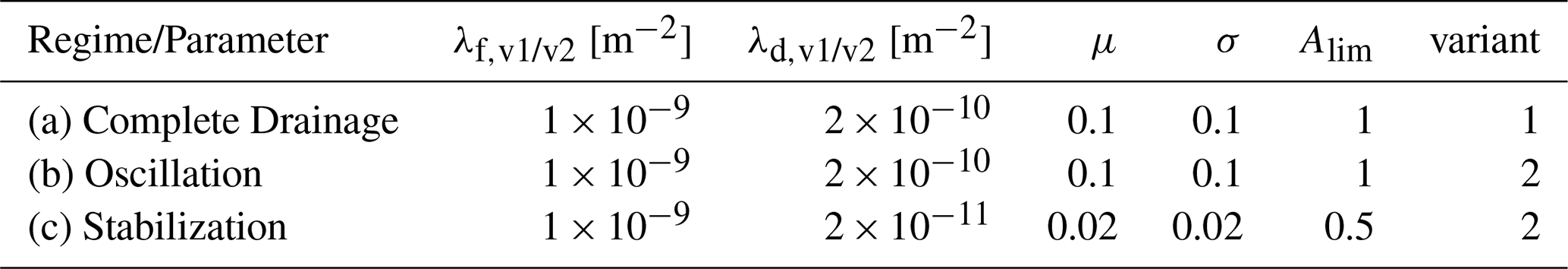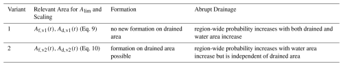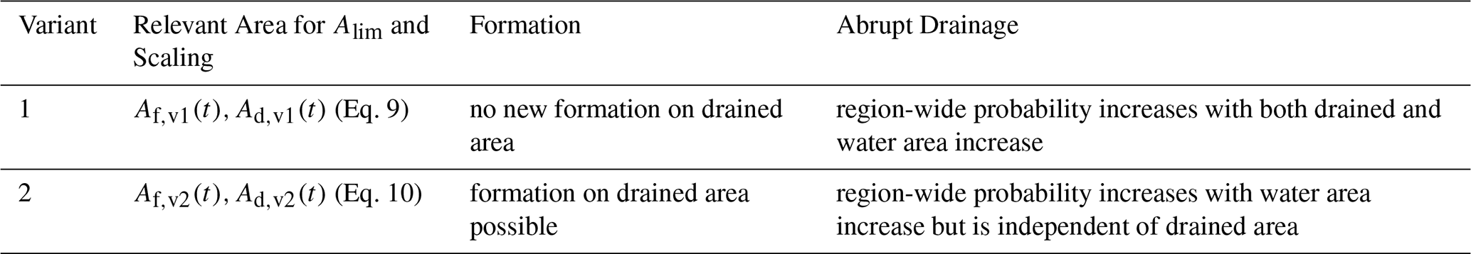 Table 1The two model variants and their respective definitions for the areas used for scaling of formation and abrupt drainage rates λf and λd according to Eqs. (1) and (8), and the underlying assumptions, or rather implicit effects, on the formation and abrupt drainage possibilities.