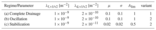 Our model is able to capture three general dynamic regimes: complete drainage of the landscape (a), oscillating behaviour of water and drained area (b), and stabilization of area fractions (c). To demonstrate these regimes, we perform three exemplary 1000 year simulations with idealized parameterizations, which can be found in Table 2. These parameter values are hypothetical and remain constant, meaning that they are independent of a climate-forcing. They are chosen to create qualitative and demonstrative examples of the regimes within the simulation period of 1000 years with a time step of one year, and should therefore not be interpreted as realistic representations of observed lake dynamic speed. Lake expansion, for example, can generally be assumed to be slower by about an order of magnitude. Most observed mean expansion rates lie between 0.1 and 2 m yr−1 with some single lakes showing higher rates of up to 6.01 m yr−1 (Jones et al., 2011). Since the parameters are hypothetical, the simulations could also be interpreted as simulations over a 10 ka year time span with a time step of 10 years. In that case, the parameter values in Table 2 would have to be considered to be per decade and not per year. All three of the simulations start with a landscape without lakes or freshly drained lake basins. The simulation area is 40 km×40 km. This size is representative of a grid cell size for the Arctic in the Max Planck Institute's land surface model JSBACH/ICON-Land (Jungclaus et al., 2022) with R2B6 resolution.