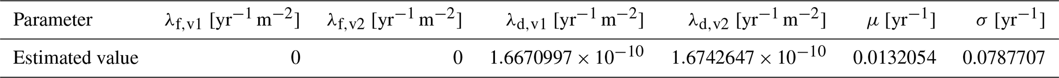 The values for drift μ and volatility σ as well as formation λf and drainage rate λd can theoretically be estimated using time series of observed lake areas. For the estimation of μ and σ, it is necessary to calculate the logarithmic returns Rlog for each lake, i.e.