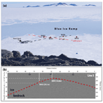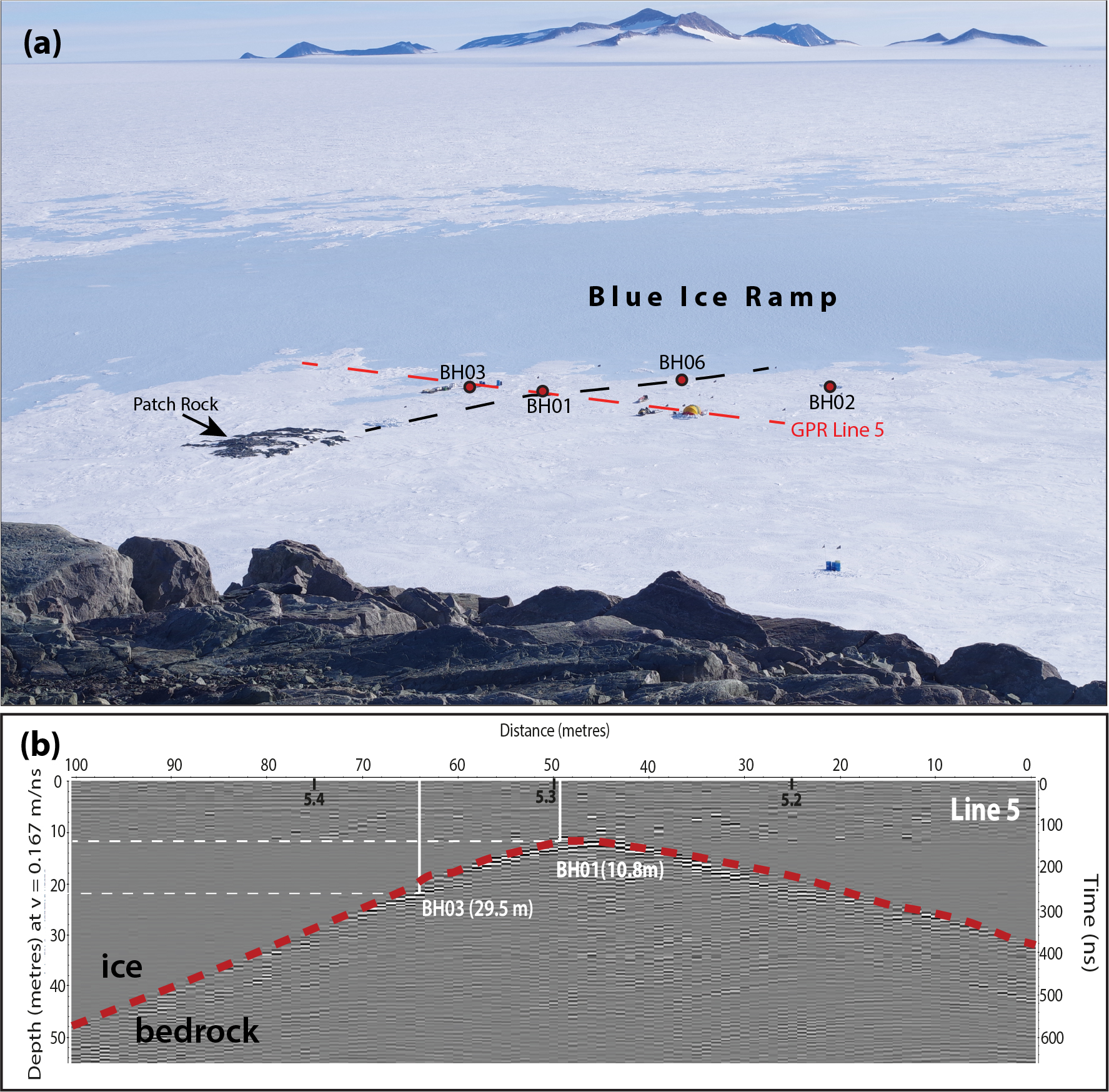 Figure 3(a) Patch Rock viewed from the top of Plummer Nunatak. The locations of the bedrock cores are shown. The black dashed line denotes the approximate trace of the subglacial ridge as surveyed before it passes underneath the blue ice ramp. Vertical relief of the ramp is ca. 10 m. GPR Line 5 is shown as a red dashed line in (a). (b) Interpreted radargram of GPR Line 5 showing locations of cores BH01 and BH03 along with measured depths to bedrock (n.b. for BH03 this is greater than depth extrapolated from two-way-travel time). The numbers 5.2 etc. denote locations of flags used as fiducial markers. GPR Lines 1–4 were located at 10 m intervals in increasing proximity to Patch Rock (see Supplement).