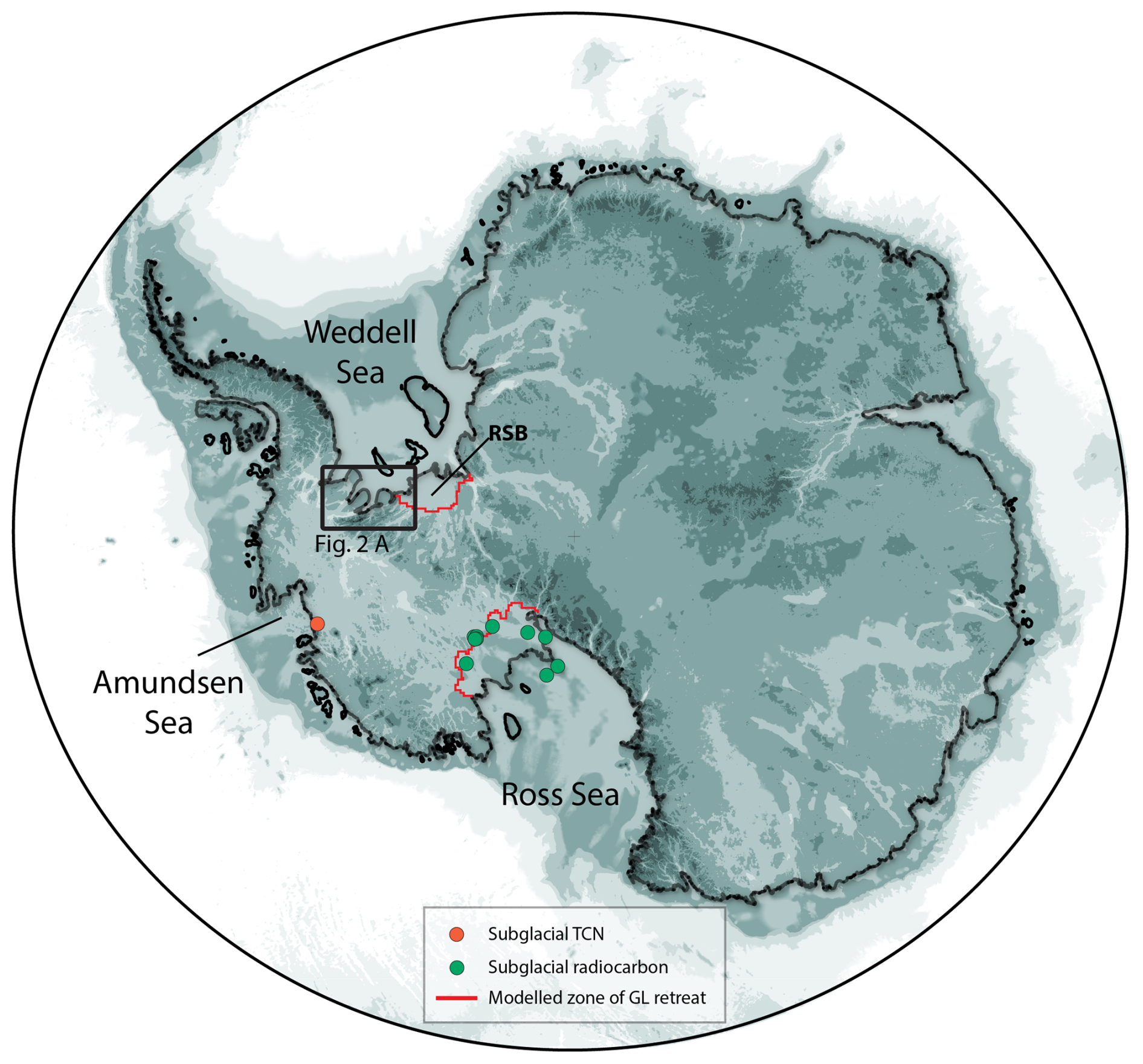 Figure 1Overview map of Antarctica showing locations where geological evidence of Holoence retreat inboard of the present day grounding line has been recovered. Modelled zones of retreat in the Ross and Weddell Sea embayments are taken from Kingslake et al. (2018), other models show similar patterns. Black box shows location of Fig. 2a. RSB: Robin subglacial basin. Base image is BEDMAP3 subglacial topography (Pritchard et al., 2025).