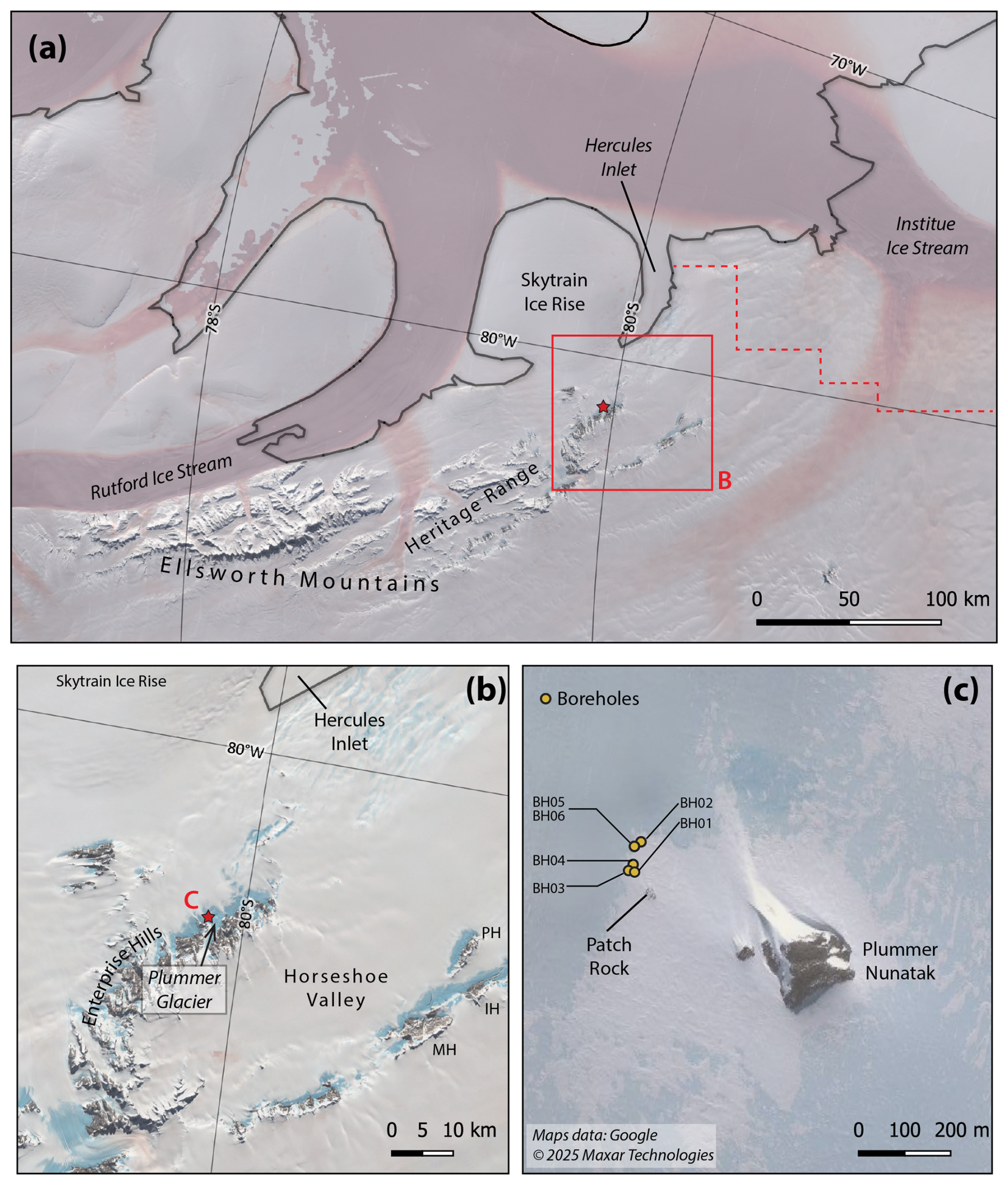 Figure 2(a) Map of the southern WSE showing major ice streams and geographical features mentioned in the text. The dashed line is zone of modelled retreat (Kingslake et al., 2018). Red star is location of our drill site. (b) Location map of Horseshoe Valley and Enterprise Hills. Location of Plummer glacier is shown. Red star is location of our drill site. Hills where cosmogenic nuclide data evidences post LGM thinning. (c) Google Earth image (Maps data © Google, © 2025 Maxar Technologies) of Plummer Nunatak. Patch Rock is visible and locations of boreholes shown. Figure generated in Quantarctica version 3 (Matsuoka et al., 2021).