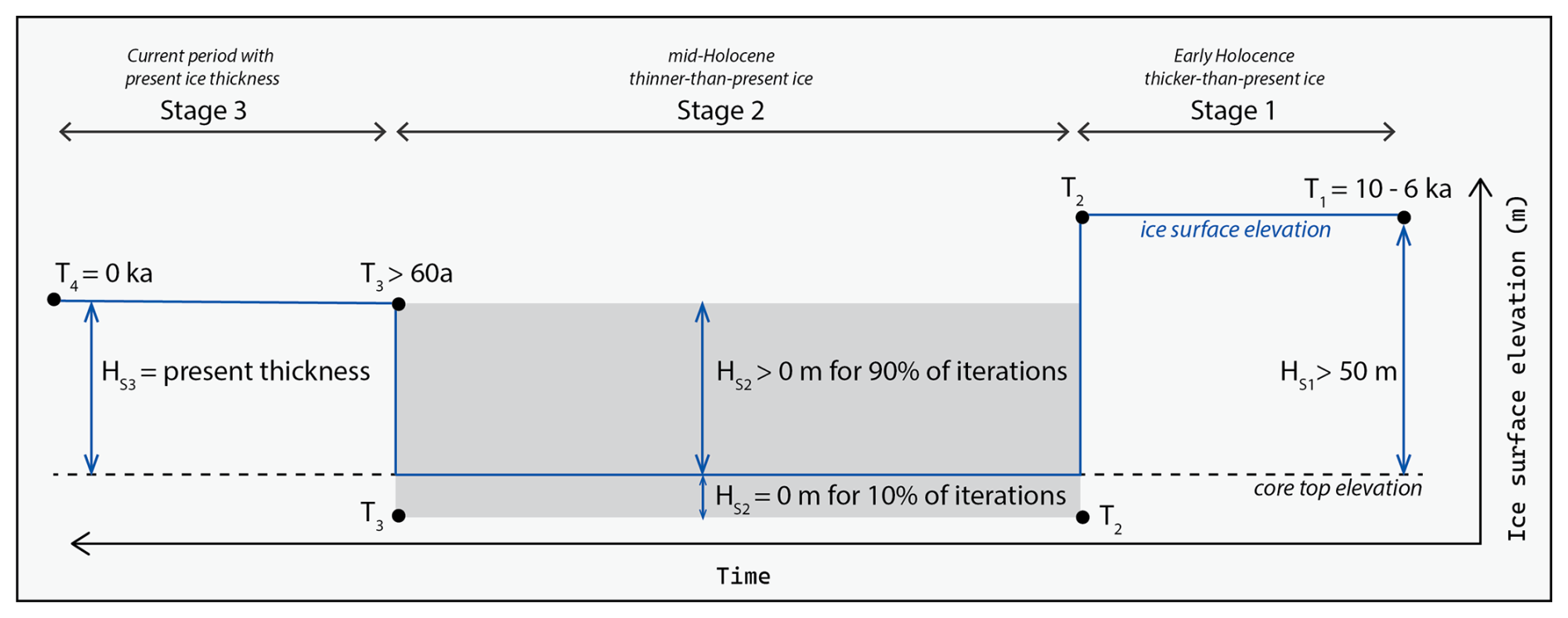 To explore scenarios of ice thickness change that are consistent with the measured concentrations we use a simple forward model for cosmogenic nuclide production under 10 000 random three-stage ice histories (Fig. 4). Stage 1 has a random start time () and represents the early Holocene when the regional ice-sheet history mandates that our site was covered by an ice that was thicker-than-present. During Stage 1 ice thickness (HS1) is constrained to be no thinner than 50 m to allow for some production by deeply penetrating muons to assess sensitivity of the model to initial ice thickness. Stage 2 (T2−T3) is a period of thinner-than-present ice that begins at a random time after T1. In all boreholes we observed a clean ice-rock transition at the bed. Balco et al. (2023) used the presence of a dirty ice layer at the base of their boreholes to infer that ice had not thinned beyond their core top elevations during the Holocene. The absence of such a layer at our sites would, by the same logic, imply that ice could have thinned below our core top elevations but does not mandate that it did so. Consequently, during Stage 2 ice thickness (HS2) is allowed to randomly vary between 0 m (i.e. total exposure of our cores) and its present-day thickness with 10 % of model iterations set to zero thickness. This allows our model to explore what duration of complete exposure is consistent with our measured concentration and what thickness of residual ice cover is possible if the assumption of complete exposure is incorrect. Finally, Stage 3 (T3−T4) represents the current period of burial by ice with its present-day thickness (HS3). The start-time of Stage 3 is also random but with a minimum value of 60 a as available TMA aerial imagery shows ice at our site was in its present-day configuration in 1962 (Fig. S3).