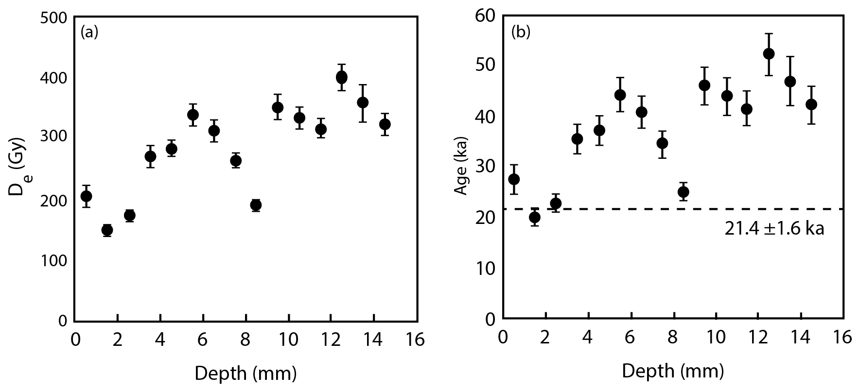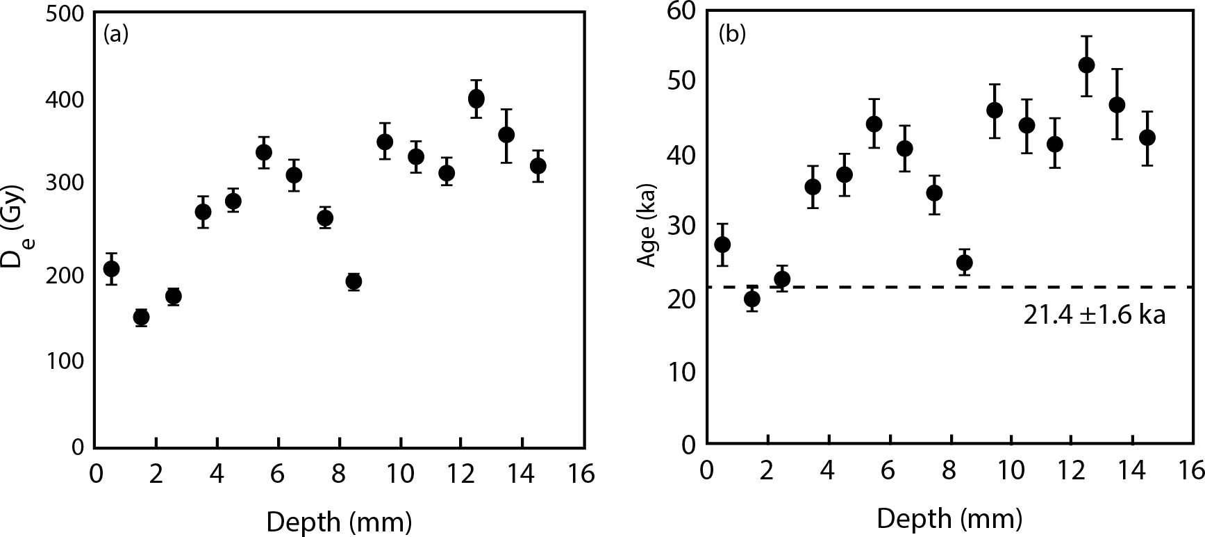 Figure 5Luminescence depth plots for sample BH01 showing De values (a) and apparent burial ages (b) measured using the OSL signal of quartz. Note that only Discs 2 and 3 (depths 1.5 and 2.5 mm, respectively) were used for age calculation.