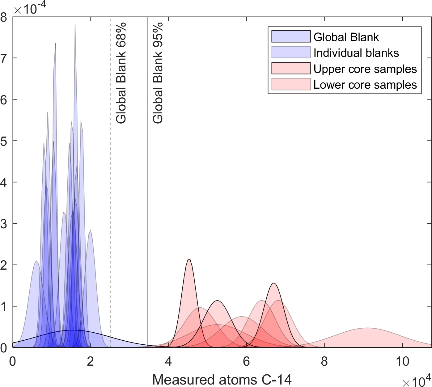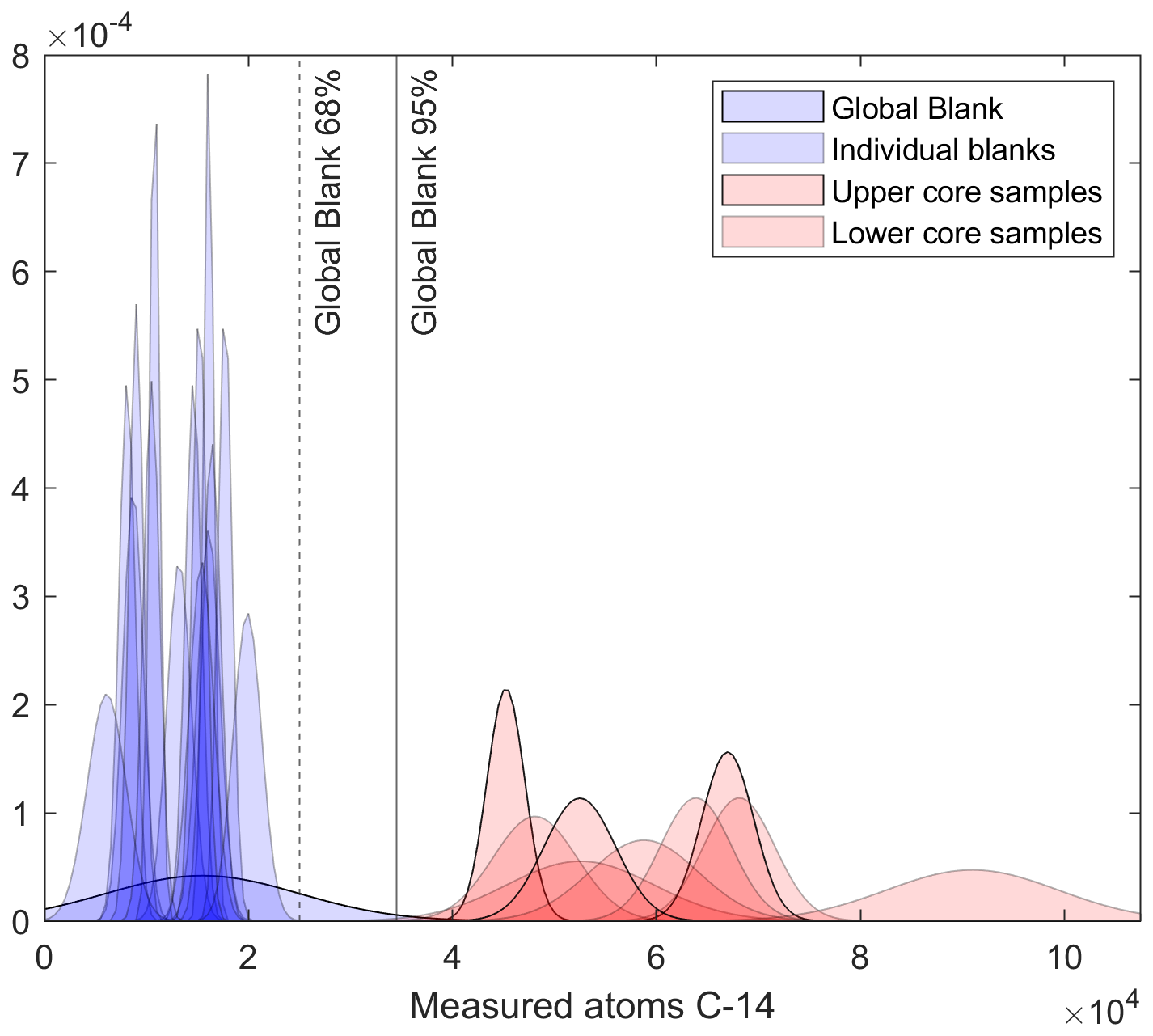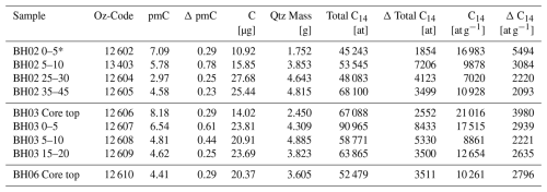 The nine samples analysed for in situ 14C yielded total inventories of 14C (Table 2). The reported total inventories of 14C are times higher than the long-term ANSTO-UoW global blank value of 14C which represents the average and standard deviation of all process blanks measured at ANSTO over the last 6 years. We processed and measured 15 individual process blanks alongside the samples presented here. The values from these 15 blanks are indistinguishable from the global blank value and show no time-dependence (Figs. 6 and S11). None of the samples overlap with any individual blank or with the long-term blank value at 68 % confidence. Only one sample overlaps with the global blank at 95 % confidence. As argued by Balco et al. (2022), a key point is that if upper core samples contain inventories of 14C that are above background then, given production systematics, 14C must be present in down core samples even if those samples have inventories that are close to blank levels. The uppermost samples from BH02 (5–10 cm), BH03 (Core top), and the single sample from BH06 are 2.9, 4.3, and 3.4 times above blank respectively, and do not overlap with the blank at 95 % confidence. We thus conclude that in situ 14C is present in our cores. The generally observed downcore decrease in concentrations of 14C (atoms g−1) in both BH02 and BH03 is consistent with production systematics of cosmogenic nuclides and further support this conclusion.