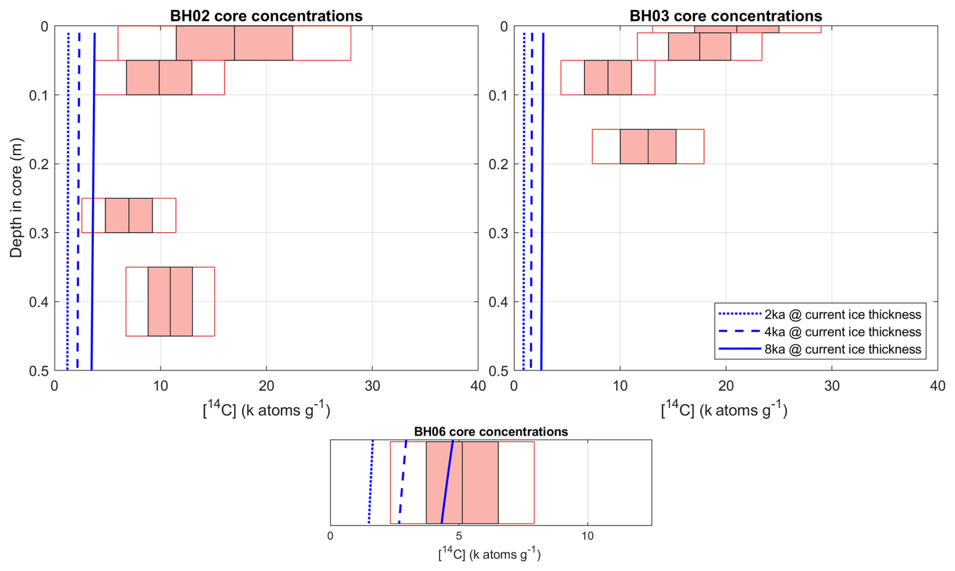 Unlike the samples from BH02 and BH03, the 14C concentration measured in the single sample from BH06 is consistent with, but does not mandate, production during prolonged (8–6 ka) burial by ice of present-day thickness which at this site is 9.5 m. However, given their respective locations, if ice thinning exposed the BH02/03 core sites then the BH06 core site must also have been ice free. Similarly, while the OSL results presented here cannot be interpreted with respect to past exposure of the BH01 core surface to sunlight, as with BH06 which is at a comparable depth, if ice thinning occurred at the sites of BH02 and BH03 then ice thinning must also have occurred at the site of BH01. We cannot exclude the possibility that BH06 was shielded by sediment and/or snow during any Holocene low stand, However, without observations such a scenario remains speculative. Importantly, we emphasise that the nuclide concentrations in both BH02 and BH03 show an unambiguous signal of increased production above that possible due to muonogenic production under present-day ice thicknesses thus requiring ice to be thinner at our core sites at some time during the Holocene.
