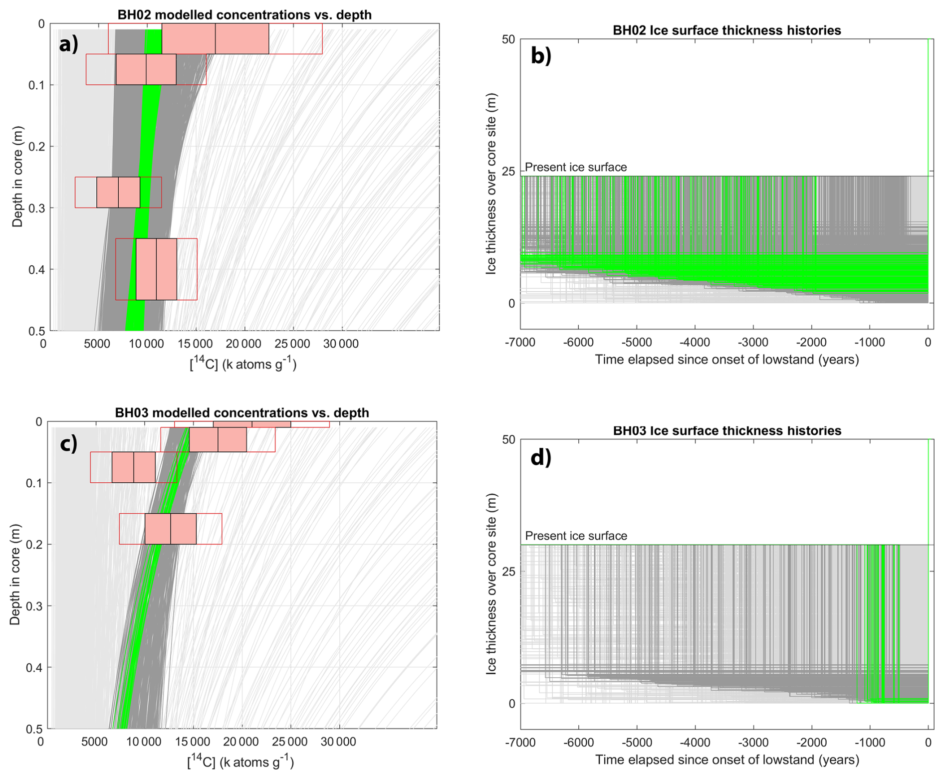 Figure 8(a) Predicted nuclide concentrations plotted against depth in core BH02. Measured concentrations shown as in Fig. 7. Concentrations predicted by the best (10th percentile) of fitting iterations shown in green, all fitting iterations shown in dark grey, random selection (n=1000) of remaining iterations shown in light grey. (b) Three stage ice histories used to produce modelled concentrations, colours correspond to the same sub-sets of iterations as panel (a). The histories, which all have different starting times in the model, have been aligned to the onset of the low stand for visualisation. (c, d) are the same figures but for BH03.