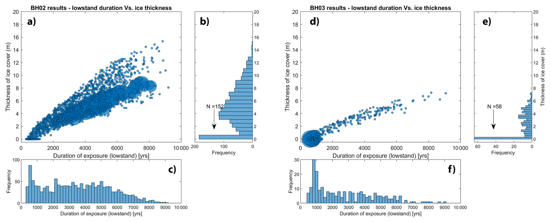 Figure 9(a, d) Low stand duration plotted against thickness of residual ice cover for fitting model results from BH02 (a) and BH03 (b). The 10th percentile of best fitting scenarios has symbol sizes scaled in order of goodness-of-fit showing that scenarios of thin ice better fit the measured concentrations in BH03. (b, e) and (c, f) are the respective histograms for the two variables, again showing that shorter, “none-or-thin” ice histories are preferred.