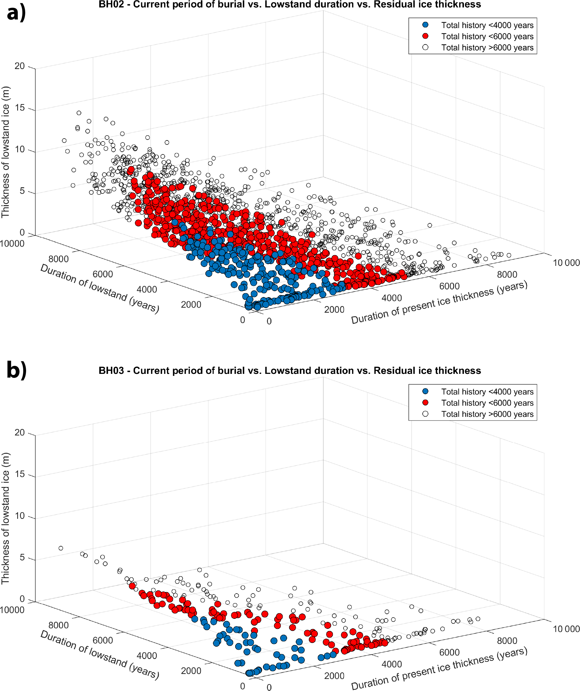 Figure 10XYZ plot of durations of low stand (Stage 2) and period of present ice thickness (Stage 3) against residual ice thickness during Stage 2 for cores BH02 (a) and BH03 (b). Nearest exposure age data imply ice surface reached modern elevations at ca. 6–4 ka thus total duration of Stage 2 and Stage 3 would be shorter than this. Such constraints narrow the range of possible low stand durations and residual ice thicknesses as shown for periods of 4000 years (blue markers) and 6000 years (red markers). Remaining accepted scenarios shown with white markers.