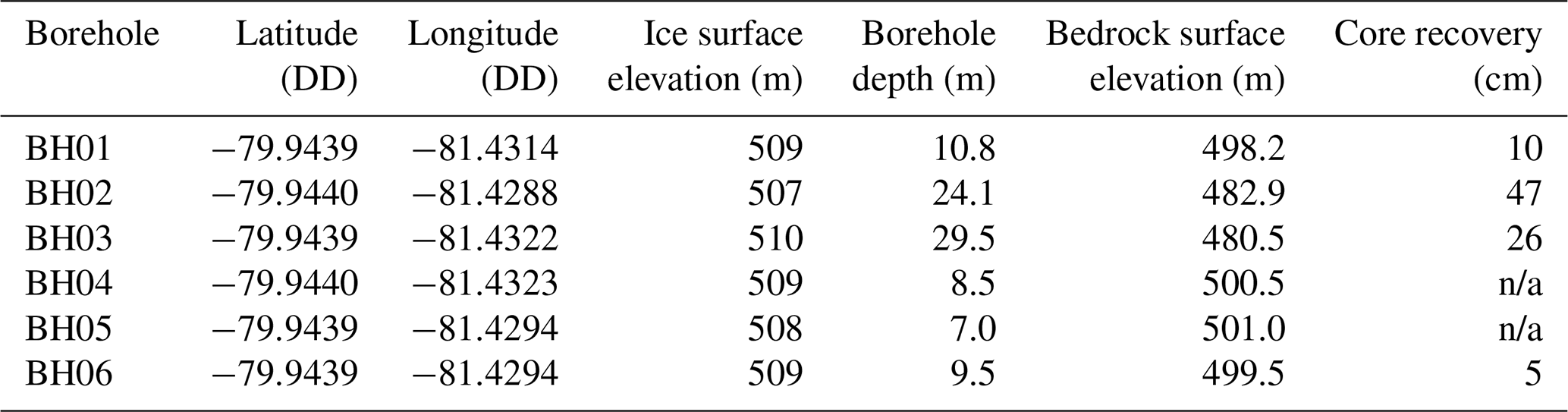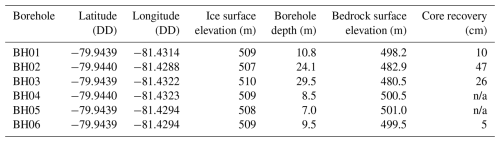 In a total of 11 d of drilling activity we drilled six access holes to depths of 7.0–29.5 m below present-day ice (Table 1). We successfully recovered bedrock cores from four of these boreholes, BH01, BH02, BH03, and BH06 (Table 1 and Fig. S2 in the Supplement). All cores were composed of medium-fine grained quartz arenites of the Crashsite formation. In BH04 we were unable to establish fluid circulation, presumably due to fluid escaping in through a fracture in the bedrock. At BH05 we hit bedrock at an unexpectedly shallow depth (7 m) and decided against sampling. At BH01 we recovered 10 cm of bedrock in our first core run but during the second core run the core barrel became irretrievably stuck. This was due to inefficient clearance of chippings following premature cessation of fluid circulation (pack off).