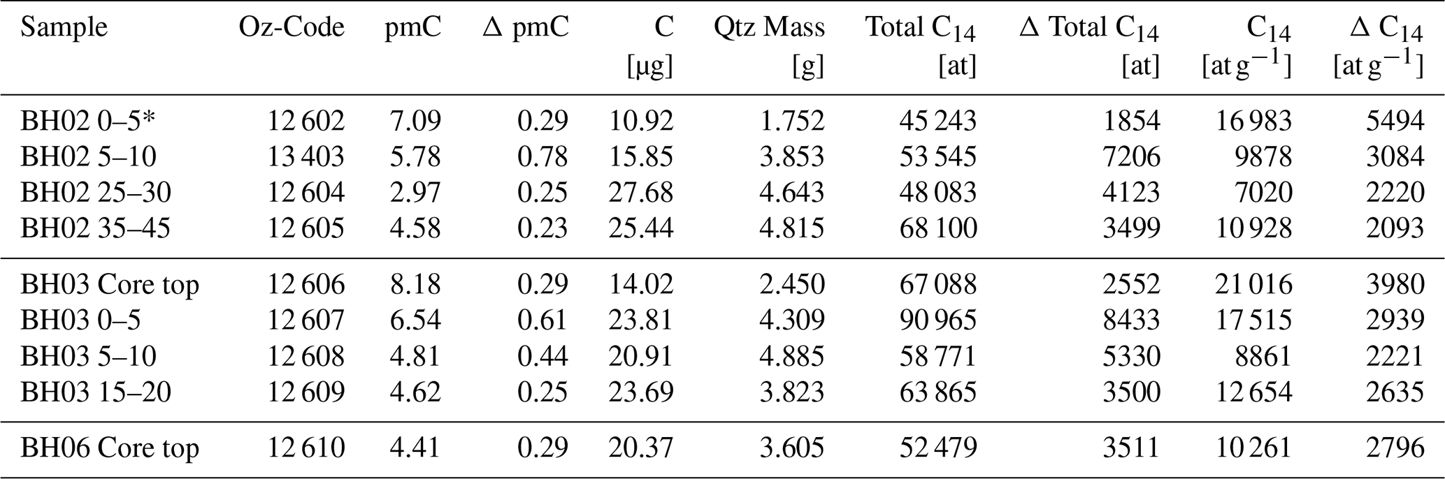 Of the remaining cores, BH02 and BH03 were sliced at 5 cm intervals while BH06 was processed as a single sample. After crushing and milling at the University of Durham quartz was purified at the Scottish Universities Environmental Research Centre (SUERC) Cosmogenic Nuclide Facility. Given the assumed high quartz content and low feldspar content of the samples froth flotation was not performed. Samples were subject to a total of 3–5 successive 48 h leaches in 1 % . Sample purity was assessed using ICP-OES with Al contents<200 ppm considered sufficiently pure. A total of ten samples were sent to the ANSTO-University of Wollongong (ANSTO-UoW) in situ 14C extraction laboratory (Fülöp et al., 2019) for carbon extraction. Prior to extraction samples underwent an additional pre-cleaning using a protocol modified from Fülöp et al. (2019). The 14C extraction scheme at ANSTO exploits the high temperature phase transformation of quartz to cristobalite to quantitatively extract the carbon as CO2. As part of this process samples are pre-heated to 600 °C for 1 h to remove meteoric 14C. Impurities of chlorite and/or glauconite produced reactions in two of our samples (BH02 0–5 cm and BH02 10–15 cm) presumably due to presence of Cl and/or K. As a result two sample tubes cracked during in vacuo cleaning. Following recovery of these samples from the coil-heaters and subsequent carbon extraction distinct discolouration of the residual material suggested contamination by the coil-heater itself and the initial samples were disregarded (Fig. S10). For one sample (BH02 0–5 cm; OZ12602) additional material was recovered from the fine (75–125 µm) fraction which was subsequently extracted. All other extractions were carried out on the 125–500 µm fraction. We thus present results from a total of nine samples (Table 2). Following extraction CO2 gas is converted to graphite targets and analysed using ANSTO's ANTARES 10MV tandem accelerator (Fink et al., 2004; Smith et al., 2010). Samples are normalised to small OX-II standards, corrected for a global graphitisation blank by 1/m analysis and data subsequently reduced according to Hippe and Lifton (2014).