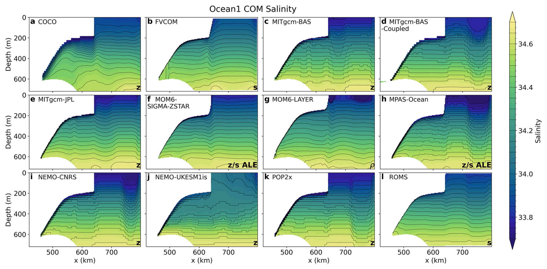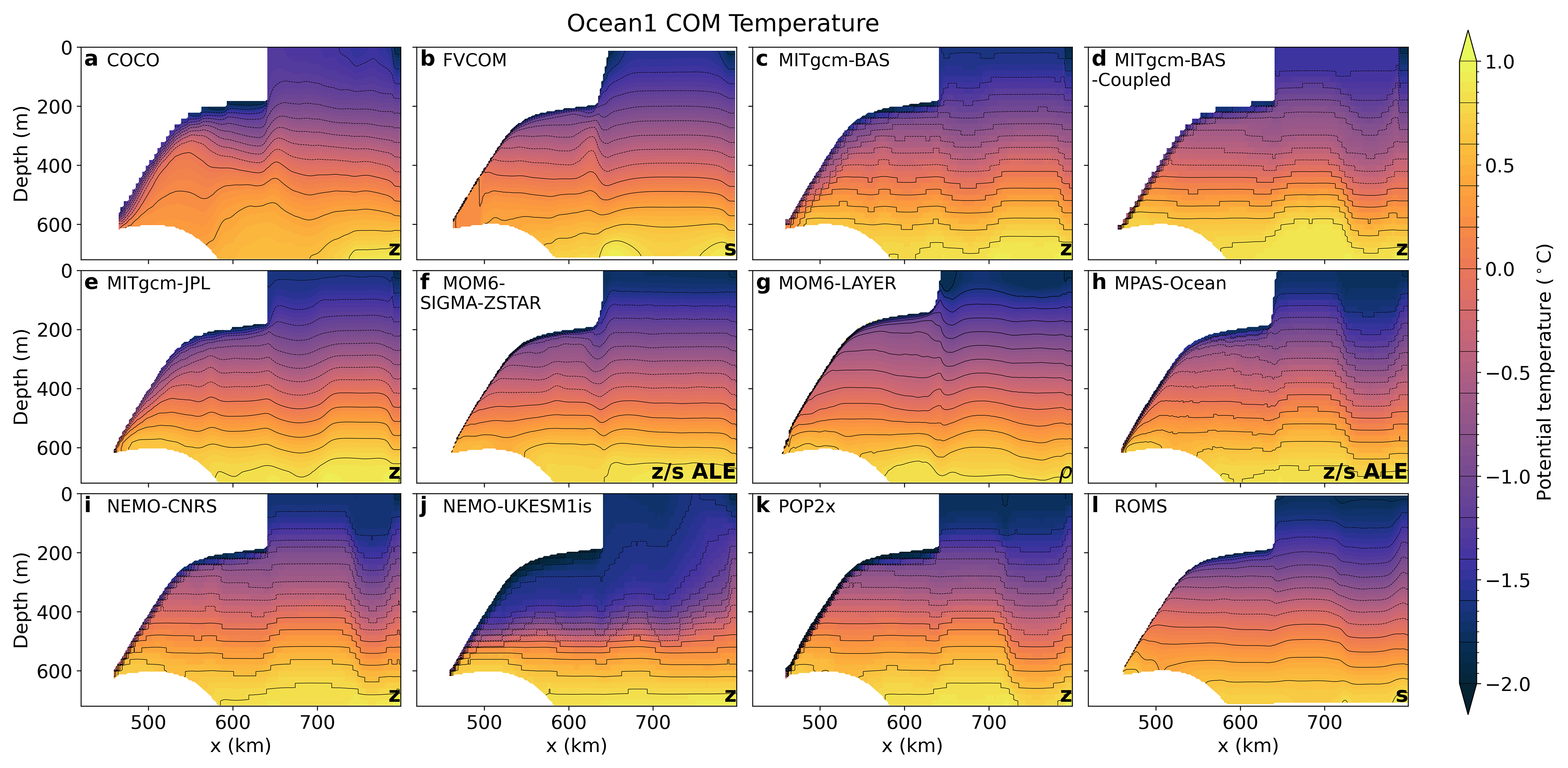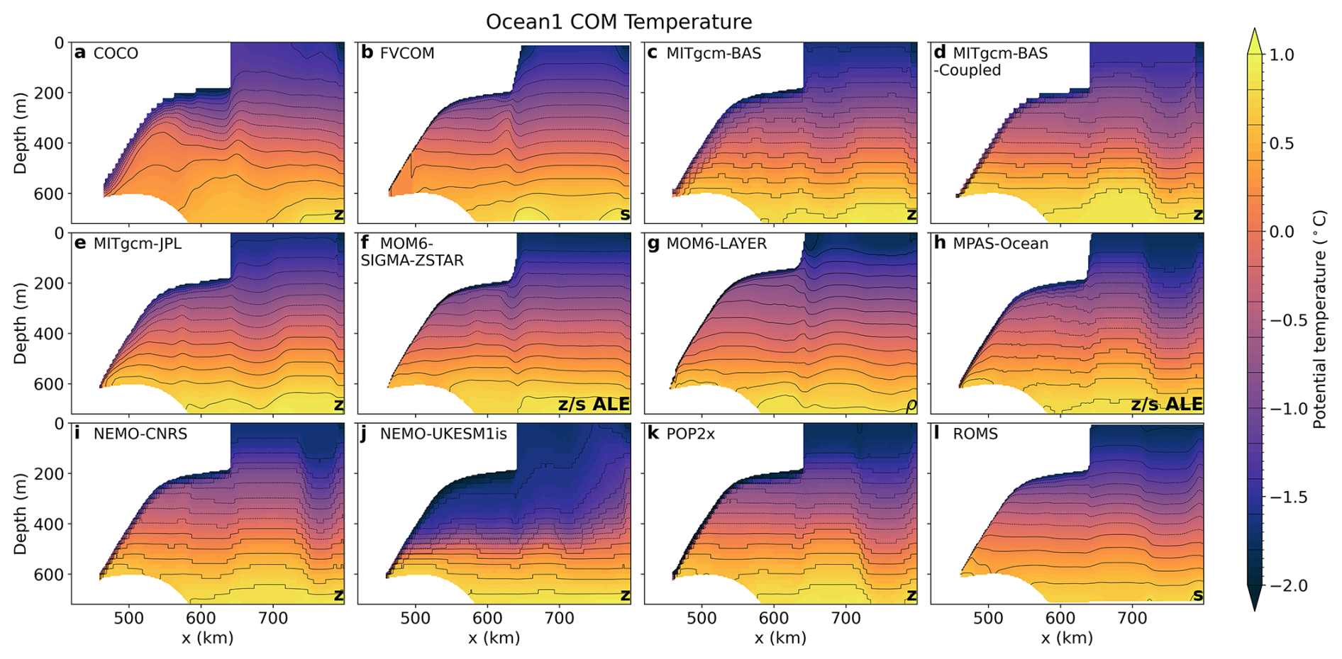 Figure 2Spun-up (average of year 20) temperature transect along y=40 km in the Ocean1 COM experiment. Model vertical coordinates are labelled in the lower right corner, with z for z-coordinate models, s for terrain-following, ρ for isopycnal, and ALE for Arbitrary Lagrangian-Eulerian coordinates with a quasi z–ice shelf-following target coordinate (Table 2). Contours are spaced by 0.2 °C.