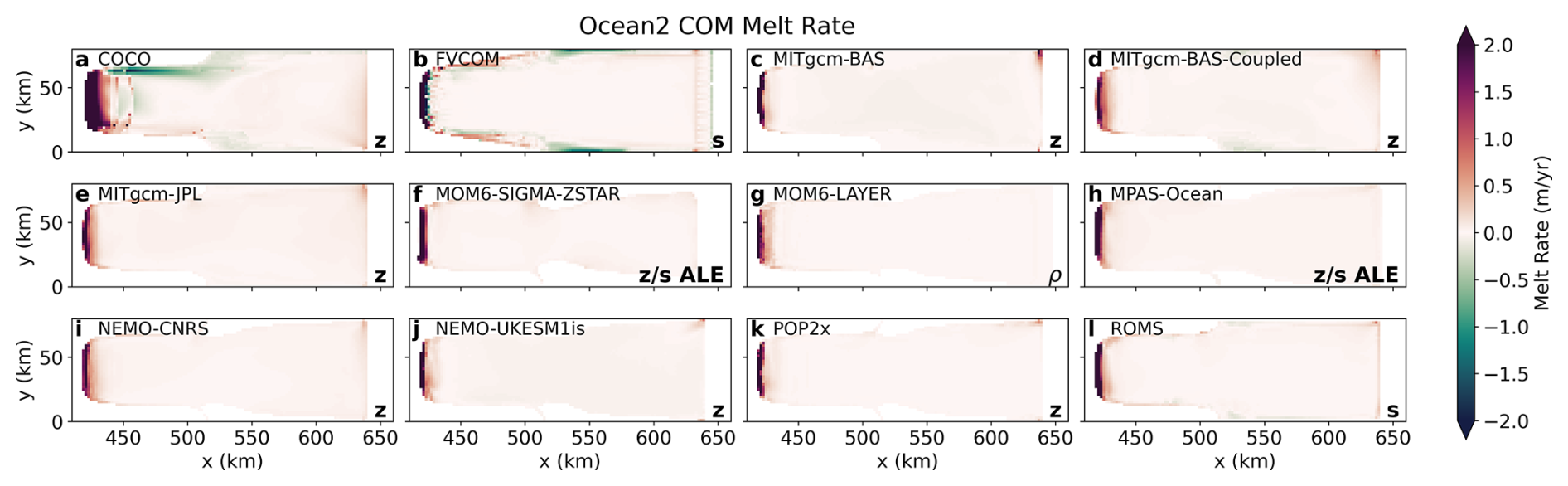 Figure 5Spun-up (average of year 20) melt rate spatial distributions for each of the 12 models in the Ocean1 COM experiment, corresponding to a warm cavity state. Model vertical coordinates are labelled, as in Fig. 2.