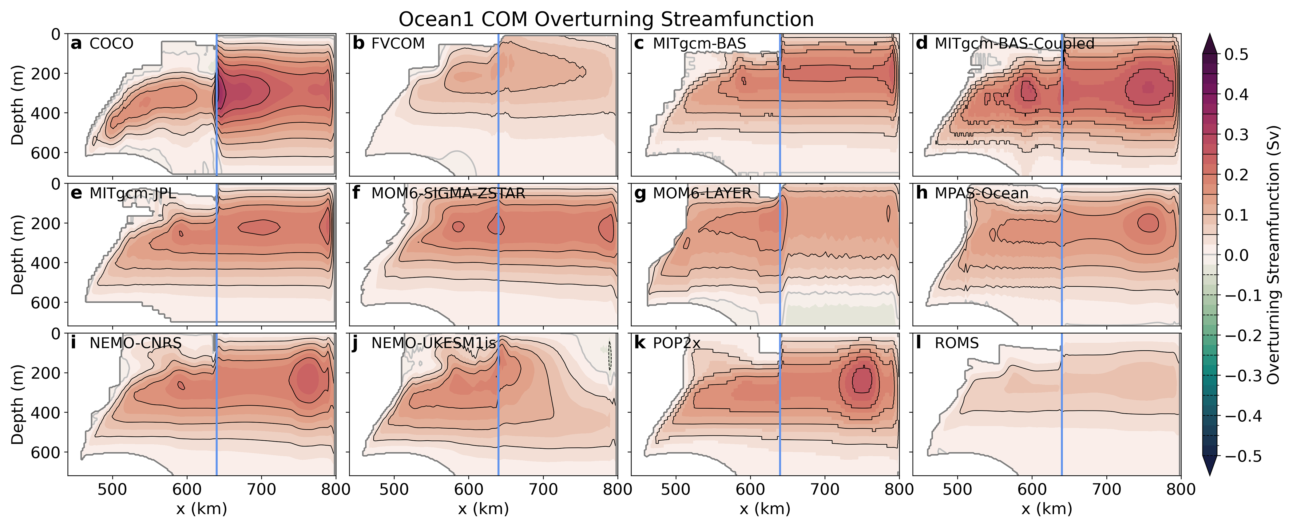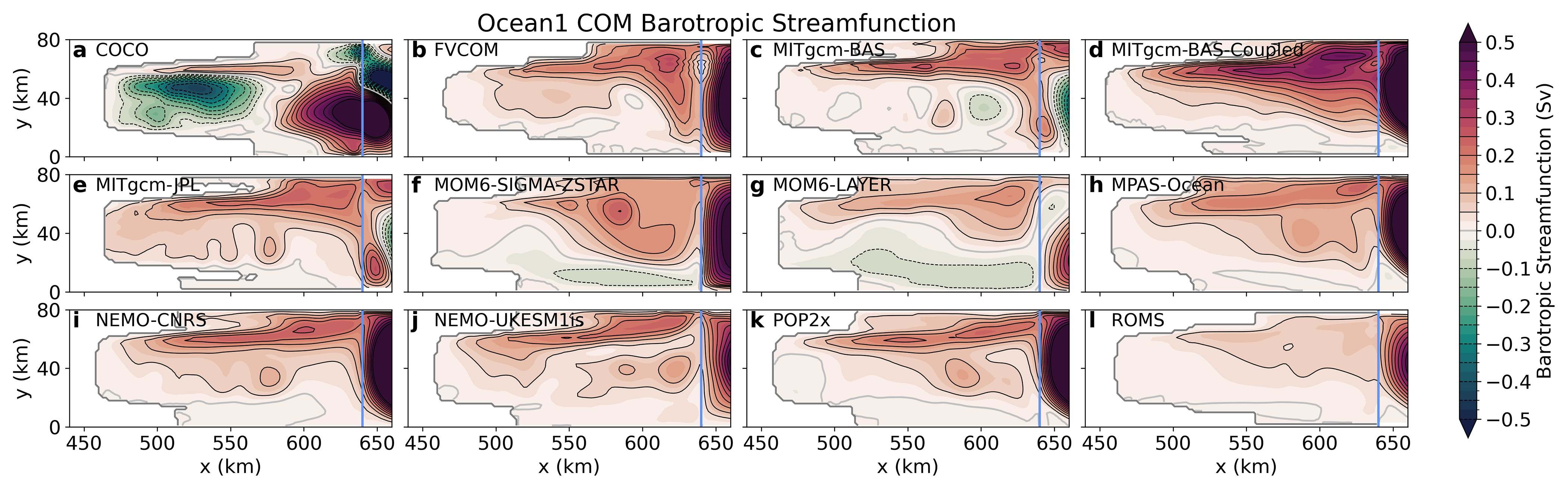 In the open ocean, Ocean1 temperature stratification (Fig. 2) and salinity stratification (Fig. 4) have distinct column-like features that are associated with barotropic gyres, discussed in Sect. 4.2. There is a front with a horizontal gradient in temperature below the calving front, and for some models, there is an additional front at approximately x=720 km, indicating the presence of one or two gyres.
