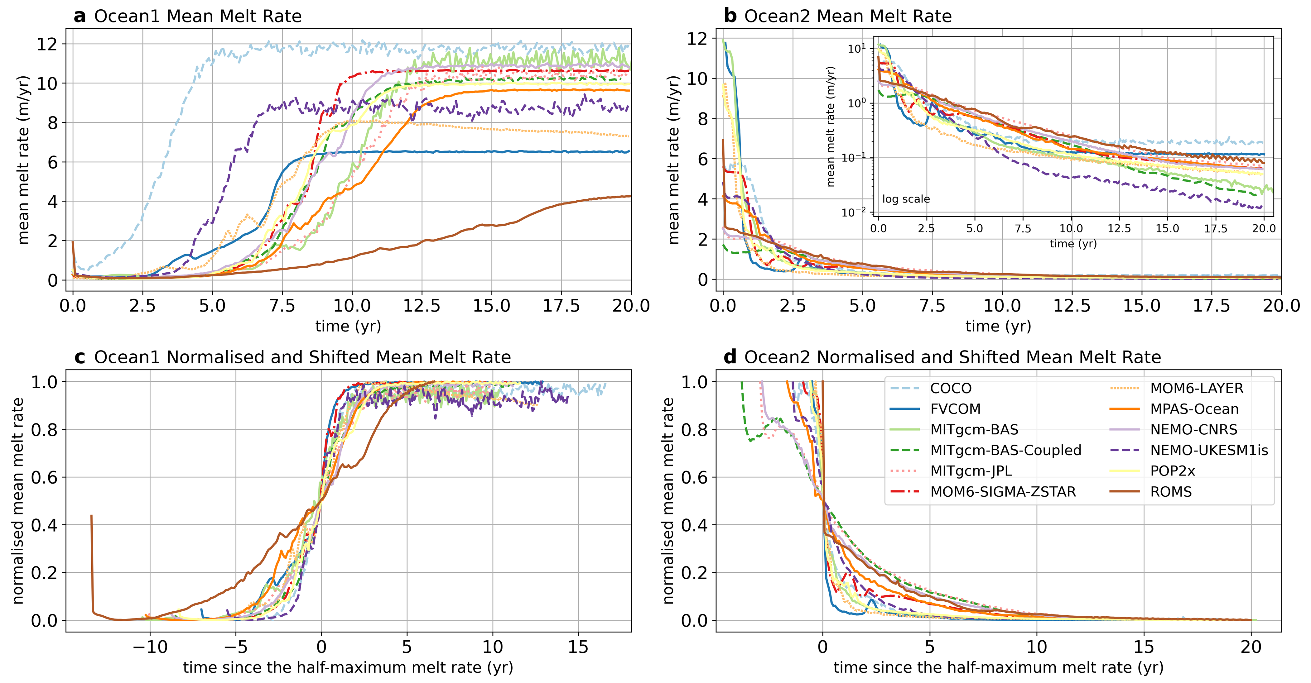 Here, we present the ISOMIP+ results, beginning with temperature and salinity transects, melt and circulation in the spun-up model states (Sect. 4.1, 4.2), then exploring the transient response (Sect. 4.3), differences in melt between models and their drivers (Sect. 4.4) and an alternative set of experiments where parts of the experimental protocol were relaxed (Sect. 4.5).