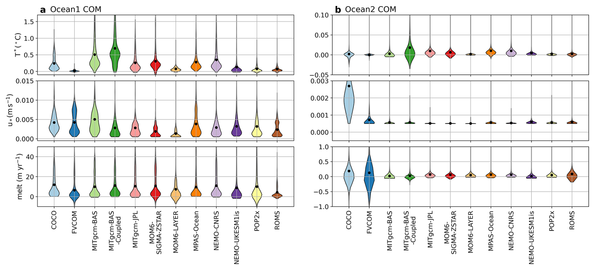 Melt rate spatial distributions in year 20 of the warm Ocean1 and cold Ocean2 COM simulations also show similarities between models (Figs. 5, 6). Melt in both experiments is enhanced at depth and near the grounding line (Fig. 7), where the thermal driving is larger. This enhancement is particularly pronounced for Ocean2, which has a steep ice shelf draft near the grounding line (Fig. 1c). Comparing Ocean1 models, the spatial distribution of melt varies, with MOM6-LAYER, MPAS-Ocean and NEMO-UKESM1is having enhanced melt at the deepest grounding line (Fig. 7a). In contrast, COCO, MITgcm-BAS-Coupled and MOM6-SIGMA-ZSTAR have enhanced melt at the cavity sidewalls (Fig. 5). FVCOM has a region of freezing on the +y side wall. Additionally, POP2x has a pronounced checker-board melt pattern. This striped pattern is also visible to a lesser extent in the other z-level coordinate models COCO, MITgcm and NEMO. For Ocean2, melt rates away from the deepest grounding line are small but COCO and FVCOM simulate significant freezing at the side walls (Fig. 6). COCO and FVCOM also have larger melting at depth near the grounding line (Fig. 7b) and also have cold temperatures near the ice base of the y=40 km transect (Fig. 3). Other models (e.g. MITgcm-BAS, MOM6-LAYER, NEMO-UKESM1is, POP2x, ROMS) also have cold temperature transects (i.e. lack the warm temperatures remnant from the spin-down observed in some models, Fig. 3) and no such freezing, however, the temperature transects do not sample the sidewall region where freezing occurs. These variations demonstrate that models can achieve similar cavity-averaged melt rates (the tuning target melt rate below 300 m is achieved by all models except ROMS and FVCOM) with very different spatial distributions of melting. These differences in melt rate patterns, particularly near the grounding line and side walls, are likely to be at least partly associated with differences in representations of bed topography and ice shelf draft between models that are enhanced near the side walls, grounding line and ice front (Figs. S11, S12). Differences in spatial distributions of melting have implications for ice sheet evolution in coupled ice sheet–ocean models as the ice thickness and therefore the buttressing effect may evolve differently depending on the location of melt.