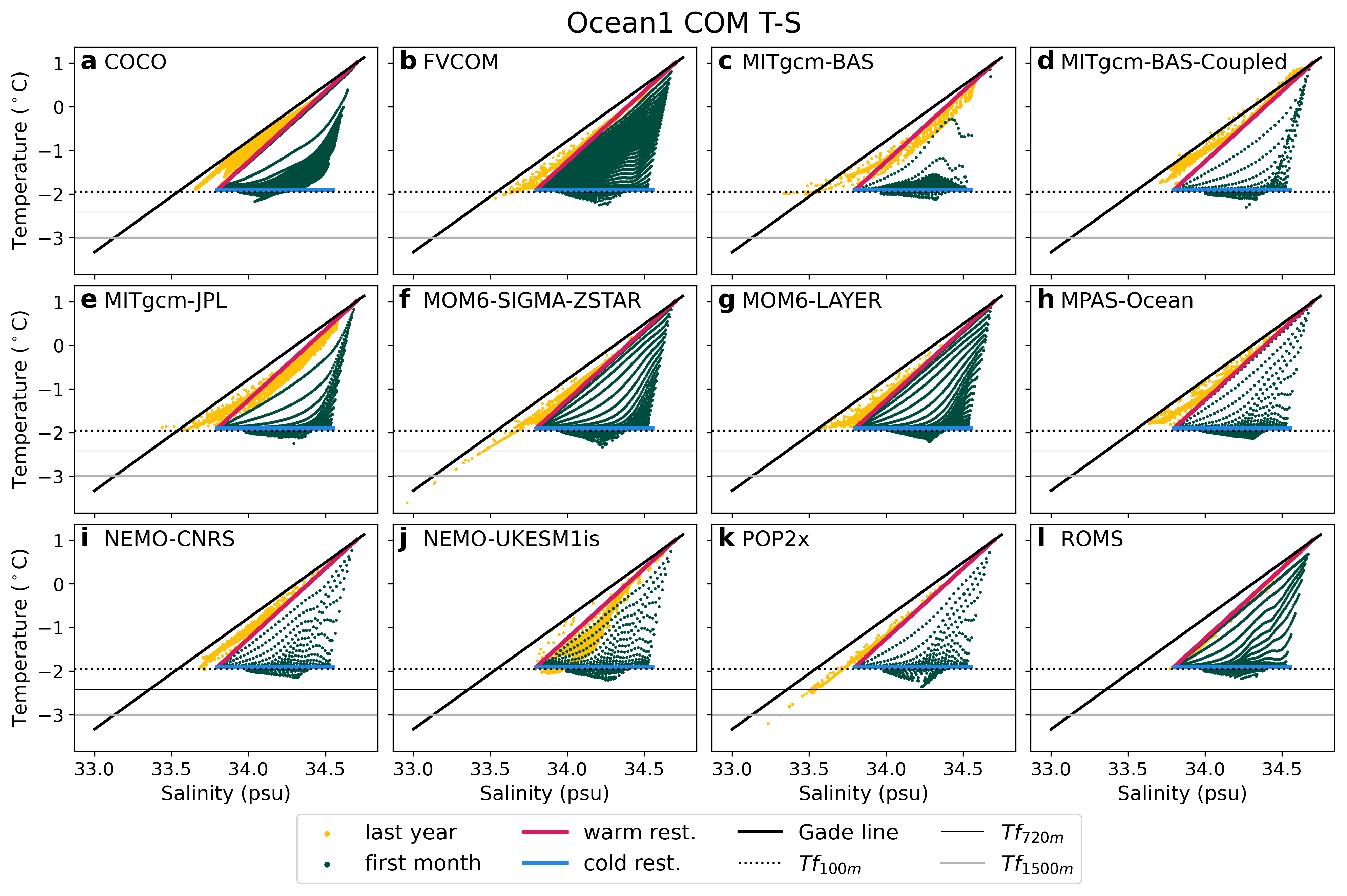 Temperature and salinity distributions at year 20 of the Ocean1 and Ocean2 COM simulations at the y= 40 km transect show similarities between models (Figs. 2, 3 for temperature and Figs. 4, S8 for salinity, noting that salinity variations control the density stratification). Though Ocean1 is initialised with cold conditions, the temperature inside the cavity resembles the warm restoring conditions at the end of the simulation, with an additional cold boundary layer near the ice. Similarly, Ocean2, which is initialised with warm conditions, ends up resembling the cold restoring conditions. However, there are differences between the models; in Ocean1, NEMO-UKESM1is has a relatively colder interior (Fig. 2j), and POP2x has a colder boundary layer (Fig. 2k, see also Fig. 14k) than most other models. The cold interior of NEMO-UKESM1is can be explained by spurious convection arising from the incorrect water flux correction, as discussed in Sect. 3.6. In Ocean2, temperatures are more uniform within the domain, matching the uniform −1.9 °C sponge forcing, but MITgcm-BAS-Coupled, MITgcm-JPL and NEMO-CNRS have a warmer interior of the cavity with temperatures reaching −1.6 °C (note the different colourbar to Ocean1, which emphasises these features). This warm interior may be associated with remnant warm water from the Ocean2 warm initial conditions that have not been circulated out of the domain by the boundary forcing; that is, Ocean2 is not yet at a steady state after 20 years (see Sect. 4.3), or may indicate spurious model behaviour. These three models' counterparts MITgcm-BAS and NEMO-UKESM1is are much colder, but also have known inconsistencies with the experimental protocol (Sect. 3.3, 3.6). The coldest temperatures in all simulations range between −2.3 to −2.0 °C, lower than the coldest −1.9 °C sponge forcing temperature. These cold temperatures are generated by the melt parameterisation and occur at depth where the freezing temperature is depressed below the surface freezing point.