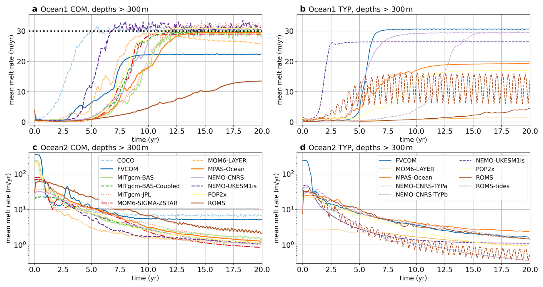 In their typical usage (for both realistic and idealised simulations), ice shelf–ocean model configurations generally differ from the prescribed ISOMIP+ protocol. For example, they may employ different mixing schemes, horizontal resolutions, or ice shelf melt parameterisations (e.g. Holland and Jenkins, 1999). The typical “TYP” simulations submitted by participants use the same geometry and boundary conditions as the Ocean0-2 COM experiments but with other parameters, resolutions, or physics schemes configured per participant choices for more conventional use, with these settings often taken from previous simulations. Since ice shelf melt parameterisations may have been modified, most TYP experiments do not use a tuned transfer coefficient to achieve the COM Ocean0 target melt rate. The TYP experiments provide an additional measure of variability between models, which are compared in Sect. 4.5. Any differences between models' TYP and COM configurations are described in Appendix A. Since participants were asked to prioritise COM simulations, not all participants submitted TYP experiments (Table 2).