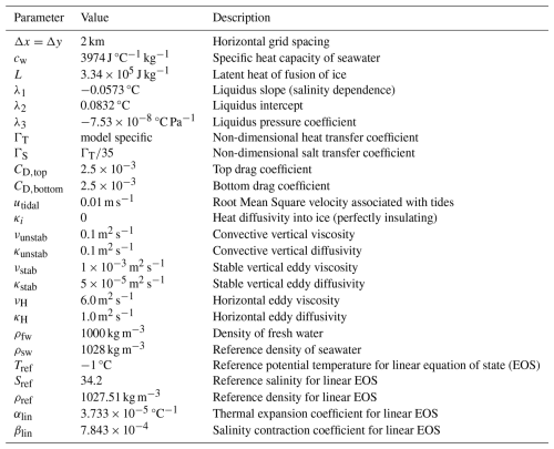 Table 1Parameters for the ISOMIP+ common experiments, reproduced from Asay-Davis et al. (2016).