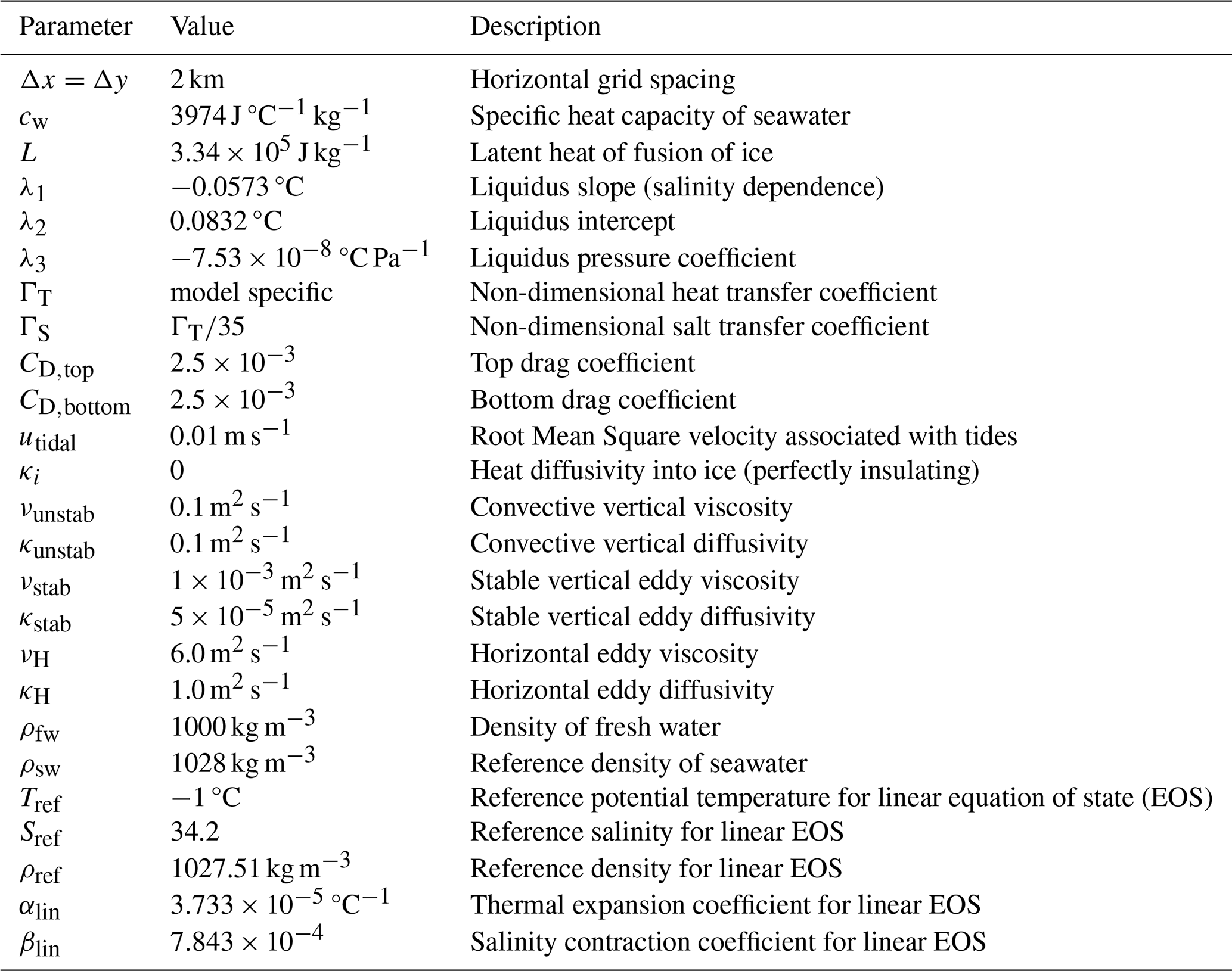 All parameters are described in Table 1. Here, the liquidus slope is λ1, intercept λ2 and pressure coefficient λ3. The melt rate mw is expressed as a freshwater flow rate (m s−1), which is solved by the equations along with the temperature and salinity at the ice–ocean interface and . The temperature Tw, salinity Sw and velocity uw represent the ocean properties outside of the turbulent ice-ocean boundary layer and can be determined by models in different ways, but are generally taken as the surface mixed layer properties or properties averaged over a constant distance from the ice. Salt and freshwater densities are ρsw and ρfw. The latent heat of fusion is L and the specific heat capacity of water is cw. The drag coefficient CD for determining the friction velocity is the same as the dynamic drag boundary condition at the top and bottom boundaries.