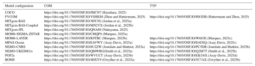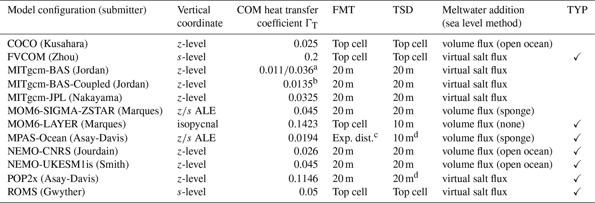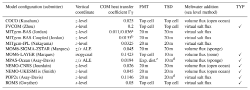 Table 2Summary of the model configuration submissions for the ISOMIP+ Ocean0, Ocean1 and Ocean2 experiments. We list the vertical coordinate (z-level, sigma/terrain-following (s-level), isopycnal, and ALE for Arbitrary Eulerian-Lagrangian coordinates. In the latter, z coordinates in the open ocean transition into an ice shelf draft-following target coordinate in the ice shelf cavity; see Stern et al. (2019) and Comeau et al. (2022) for further details), heat transfer coefficient for COM experiments, the flux mixing thickness (FMT, vertical distance over which meltwater was spread), tracer sampling distance (TSD, for the melt parameterisation), meltwater addition method and whether TYP Ocean1 and Ocean2 experiments were also submitted. The method of meltwater addition is either a virtual salt flux or volume flux. In the case of a volume flux, we also specify whether the sea level is constrained to be constant via an adjustment applied to the entire open ocean, applied to just the sponge boundary, or not constrained (“none”). COM salt transfer coefficients were fixed according to .