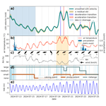 Acceleration maps were derived from smoothed velocity maps as follows: For each pixel in the velocity map, a temporal smoothing was applied. Therefore, a 30 min interval time-series covering the entire two-week period was processed for each pixel using a Butterworth low-pass filter with a cut-off period of 12 h (Fig. 2a and a). The Butterworth low-pass filter and the according cut-off period was chosen because this configuration was found to perform best to effectively suppress outliers while still preserving the full diurnal velocity variability. The filtered value for each time-step was subsequently used to update the corresponding pixel in the velocity map. Finally, the gradient between two consecutive smoothed velocity data points was calculated and divided by the time difference, yielding acceleration estimates for every time-step and pixel.